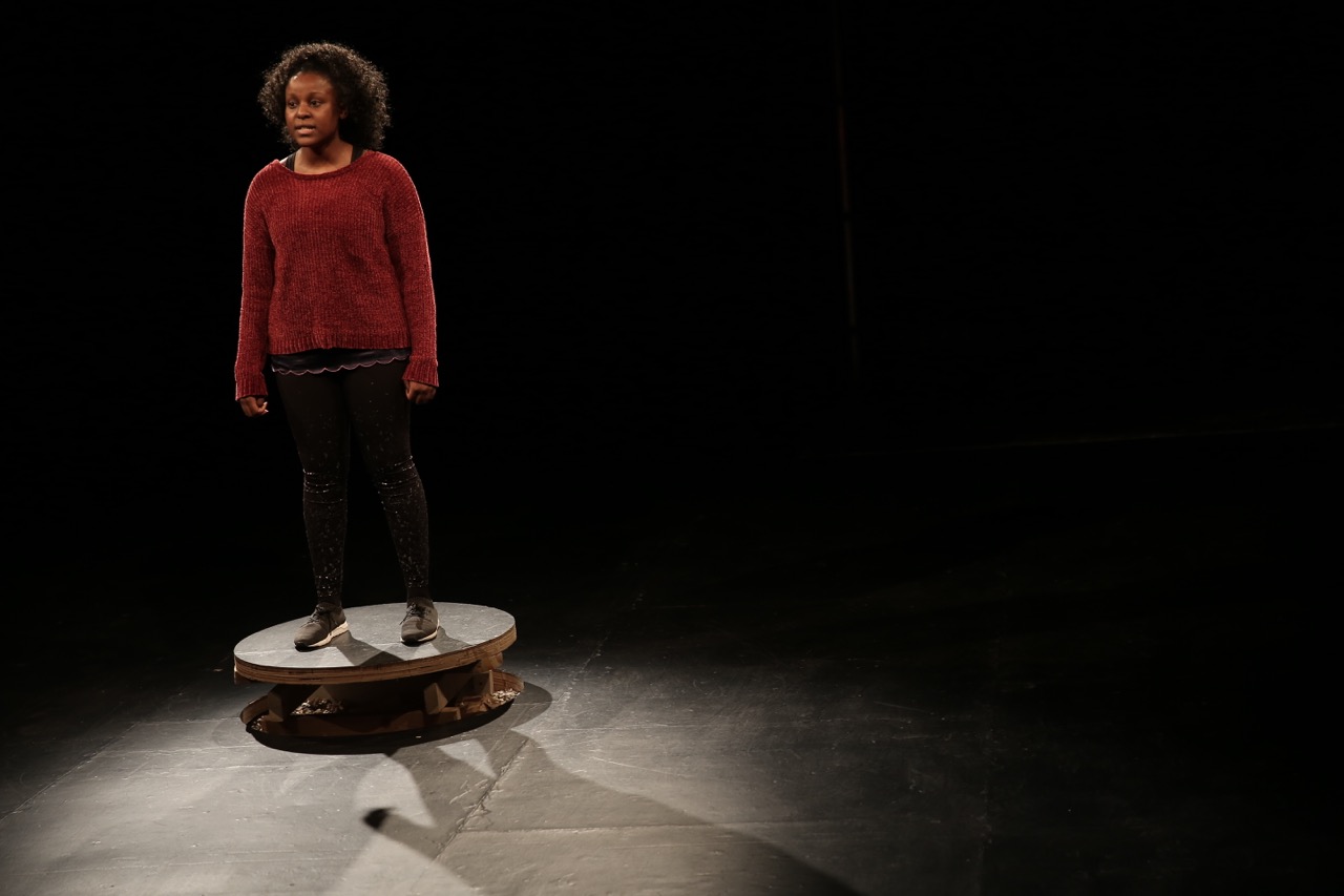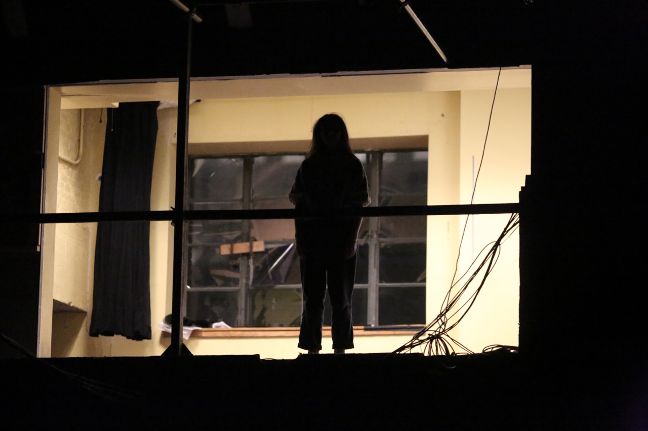In Queens Row, Maxwell pares away nearly every layer of theater—character, narrative, image, and movement are minimized or submerged. The staging shows that less really can be more: in spite of the sparseness, these monologues acquire a mythic charge, making us wonder—just how human are these figures appearing before us on the raised pedestal? Maxwell tips to the supernatural throughout: the never-seen man has gone missing in an epic battle, leaving a mother, a lover, and a daughter. And—do we perceive deities or demons in the darkness (an extended blackout), or in the flickering lights between sequences? What to make of the enigmatic silhouetted observer we glimpse on an upstage balcony?