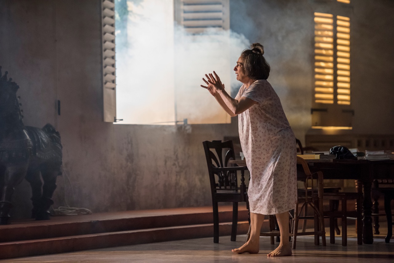 In her dreamscape, actors tumble in through the windows, and she fires at them with a machine gun. Suicide-vest-wearing baddies proliferate, and the room sometimes fills with smoke or a storm of newspapers. And whenever she says she hasn’t got any ideas, the fantasy cracks open and the Terukkuttu performers arrive—either the whole company rushing in for a production number, or one by one. (A king, his gold-and-red headdress as tall as a wedding cake, stamps his foot, then disappears into a billow of fog.) When she’s awake, realistic drama intrudes as well: the wonderful Nirupama Nityanandan plays Madam Murti, the troupe’s host, who’s trying to protect her housemaid from being sold into sexual bondage. In one moment, her exasperation at the company’s many mistakes cuts through the miasma of artistic paralysis: “You want to look at women in the Mahabharata? Why not talk to the women in India?”