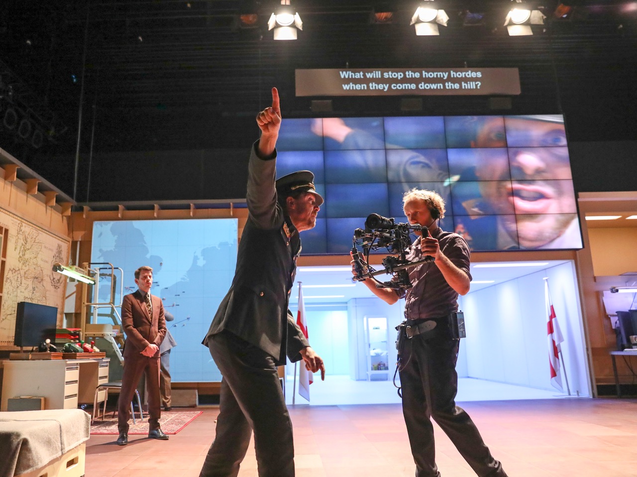 When we talk about Van Hove, we’re also speaking about his brilliant designer and partner Jan Versweyveld. Versweyveld is endlessly inventive with stage architecture, but the texture of his pieces is almost always Euro sci-fi minimalism: Roman Tragedies took place in an Ikea-smooth lobby, A View From the Bridge lived in a Mies van der Rohe cube. Kings of War turns this aesthetic inside out. The 2001 sleekness is still there somewhere, but it’s only seen indirectly. The set we do see—mustard-yellow and cluttered with rugs, maps, and a red phone to Paris—looks like a mid-century military bunker. (It’s based on Churchill’s Cabinet War Rooms.) A bright white antechamber leads to an exit deep upstage, which leads to a ring of white hallways out of sight behind the set’s walls. Characters prowl along these hidden “corridors of power,” followed by a Steadicam operator whose footage appears on a screen looming over the main part of the stage. Effectively, then, there are two sets—one physically present and roughly realistic, the other a changeable labyrinth that (thanks to invisible segues to taped footage) can be full of soldiers one moment, a herd of sheep the next. Whichever king is winning, the set always triumphs—here is the apotheosis of Versweyveld’s attempts to integrate filmed reality into live performance.