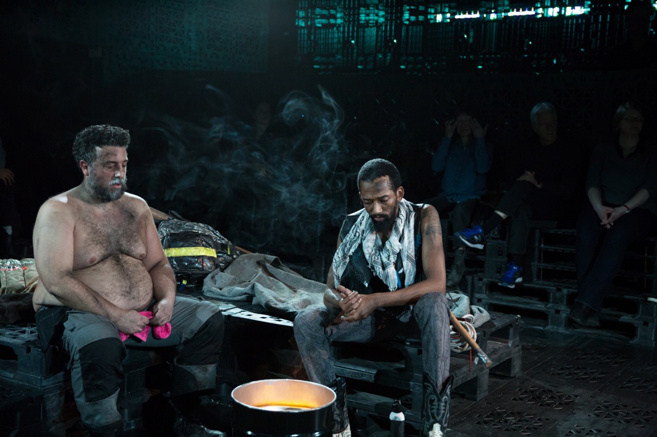 On their way, they meet other wanderers (including a Mother Courage–like Vinie Burrows) who turn out to be the Messenger’s own family. This is John Ford logic, in which a wilderness is empty except for those that you’ve done wrong. There’s a chance for resolution or revenge here, but the Western plot abruptly vanishes; its shotgun bluster drops away. The set—Louisa Thompson’s grim, black theater-in-the-round—erases itself in a white fog bank, then plunges into pitch darkness. (These gestures are Thompson and Benson’s way of honoring impossible instructions in the script: stage directions like “Platforms rise up and breathe” have to be interpreted somehow. Maxwell’s recent The Evening, which dissolved at the end into white smoke, may have been their inspiration.) In the dark, we hear Earle’s whiskey voice telling a story about a man’s nighttime hike with his small daughter. In this sweet, rueful monologue, man and child walk up a ridge as the path grows faint. They hear a wild horse, frightened and stumbling, crashing through the underbrush. “He’ll work his side of the street,” the man says, comforting the little girl. “And we’ll work ours.”
