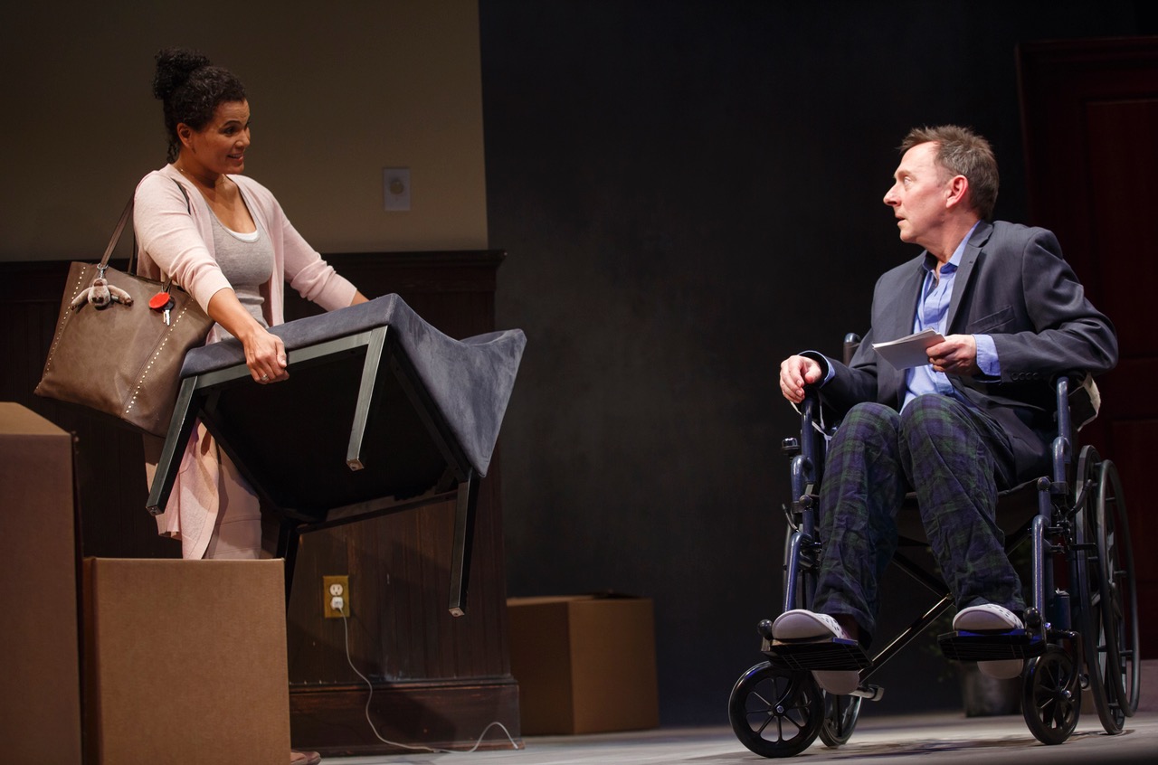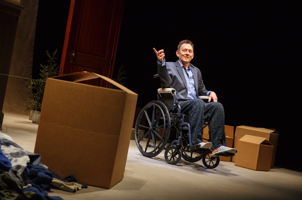 We first see the allegorically named Guy (played by Michael Emerson), dressed in only pajama bottoms, facedown on a beige carpet. He jerks up and stares at us. “Is it now?” he asks. “I thought I had more time.” There’s a swift blackout; lights up. And now Emerson is seated, a sports jacket on, nestled into a wheelchair and slippers.