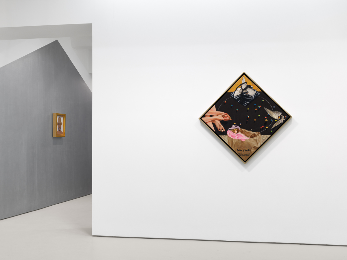 Hendricks (1945–2017) was a renowned contemporary painter who made a significant contribution to portraiture (with him, constellations of dozens of artists enter the room: David Hammons, Kehinde Wiley, Lynette Yiadom-Boakye, Wangechi Mutu, and the late Pope L., to name a few). He was an important figure in the Black Arts Movement. Here, it is captivating to see him seamlessly dance, like Muhammad Ali, between forms, collage, painting, mark-making, and the use of materials like glow sticks, graphite, gold leaf, and oil. An undercurrent of mischief runs throughout the exhibit. There are pop-culture references, cupids that suddenly appear, women’s feet, and inverted pyramids that resemble feminine pubic areas. (All of this points to not just cosmic but also sexual ecstasy.)