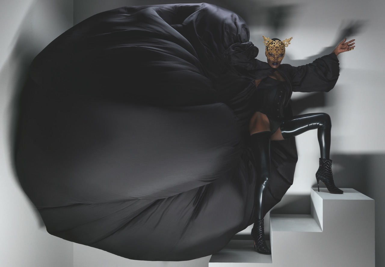 Impressions of Jones rotating in her eternal hula hoop, a childlike device that she admits, in her 2015 memoir, has provided her with “a form of protection.” Impressions of Jones in Spanish Town, Jamaica, the place of her birth, sucking up the juice of a coconut; a vignette of Jones backstage at a television show in France, having striped her face in her particular reds, preparing to perform her disco interpretation of “La Vie en Rose.” It is a fever dream scene, Jones approaching the sound stage in a sequined suit and coordinating headpiece. “I look like a bug from outer space,” she mumbles. The stage is drowned in a queasy pink. Dancers in baby-doll slips vamp around Jones, who is astride a stool in dominant pose. Many in the French crowd, which include children, sway in unison like they are possessed by something outside of music. Afterward, Jones admonishes the director of this televised farce. “If someone showed me a picture, with all these women around me like that, I would say, ‘I am a pimp!’”