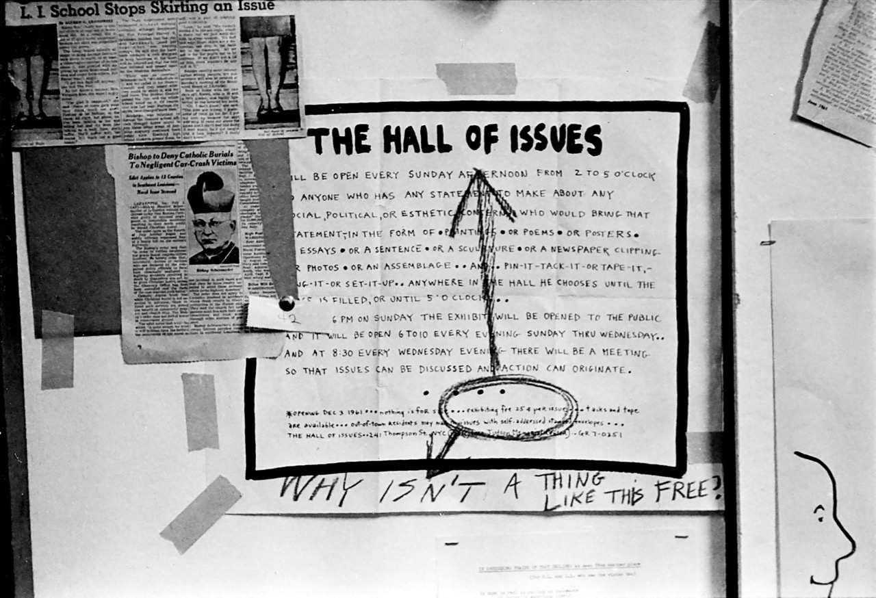 Steven Schapiro, Graffiti on announcement for Hall of Issues, Judson Memorial Church, New York, c. 1961. Digital print, printed 2016, 8 × 10 inches. Image courtesy the artist.