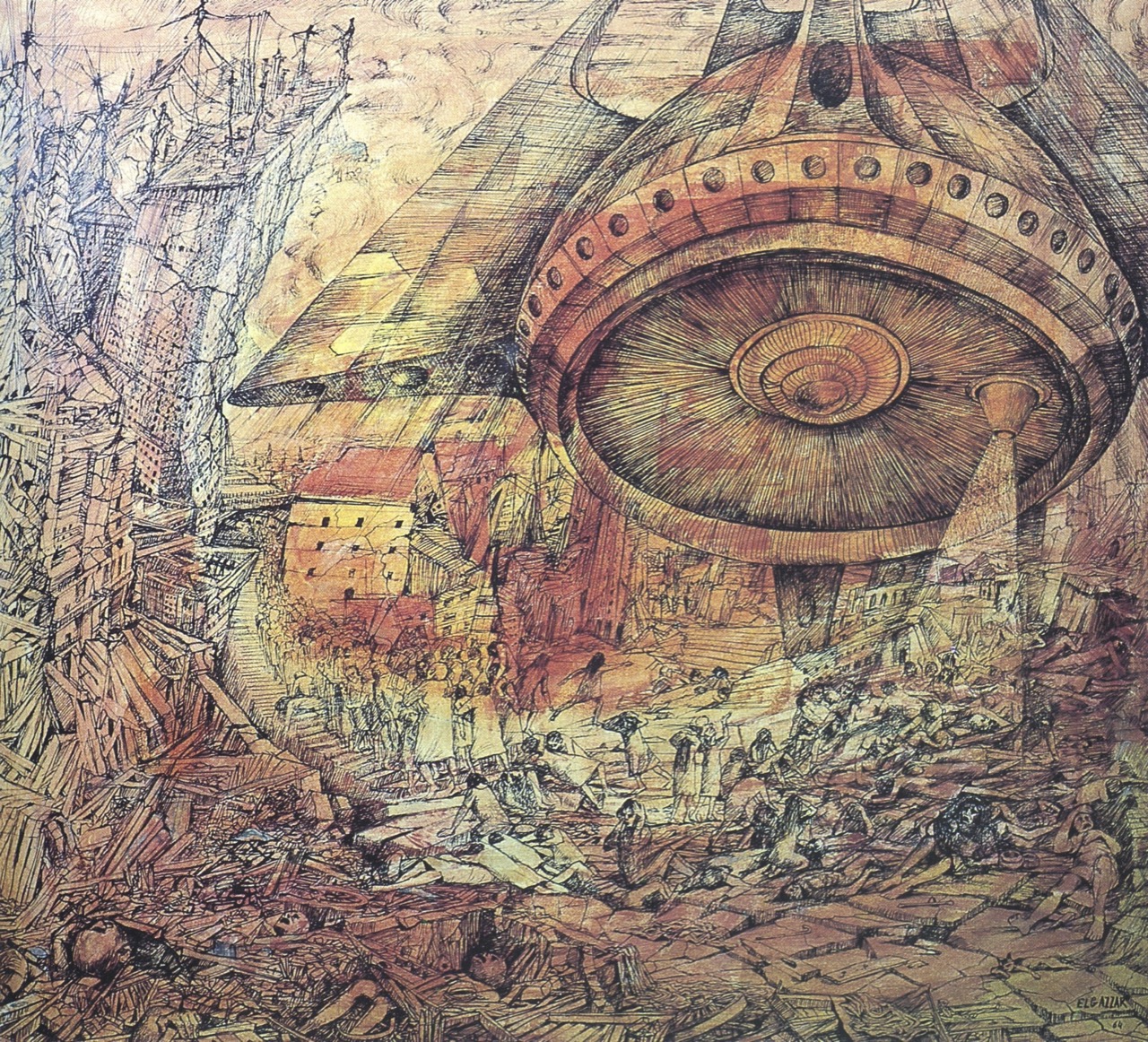 Abdel Hadi al-Gazzar was one painter in a trainful of artists selected in 1963 to visit the Aswan Dam, during its Soviet-funded construction in the south of Egypt. The trip was sponsored by Gamal Abdel Nasser’s revolutionary regime, which wanted Egypt’s finest to immortalize the president’s dazzling technological triumph over nature. By then, Gazzar certainly was considered one of the finest, if not the preeminent, painter of the new postcolonial state. As was to be expected, his resulting painting, the award-winning The High Dam (1964), was immediately celebrated by officials as an icon of the Nasserist era. But the Aswan experience also provoked a fantastical body of work that the artist largely kept private. His first India ink drafts of the scaffolds and cranes and pipes and machineries he saw there started out as sober visual chronicles of a sublime work site, but soon that sublimity would explode in his vision. Those machineries took on lives of their own, crawling spiderlike across the page and melding with impoverished human and animal forms. Then, a UFO alights to blast this whole invented world down (A Body Falling from the Sky, 1964); and now look, three wrinkled, pastel-colored alien beasts have materialized, whirling their eyes as they crouch beneath transparent membranes in a landscape punctuated by inexplicable equations (Falling Objects, 1964). Though Gazzar had employed futuristic imagery prior to Aswan, the style of these compositions is a world apart: they are claustrophobically covered with inscrutable details, webbed with a multitude of agonized lines, drawn by a cramped and manic hand.