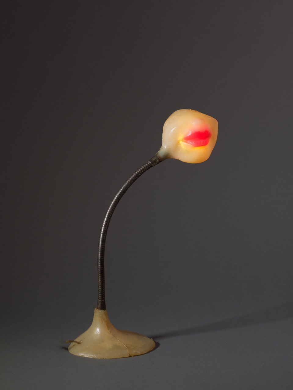 Alina Szapocznikow, Illuminated Lips, 1966. Colored polyester resin, light bulb, electrical wiring, and metal, 16 7/8 × 5 7/8 × 4 3/8 inches. © ADAGP. Courtesy the Estate of Alina Szapocznikow / Piotr Stanislawski / Galerie Loevenbruck / Hauser & Wirth. Photo: Thomas Barratt.