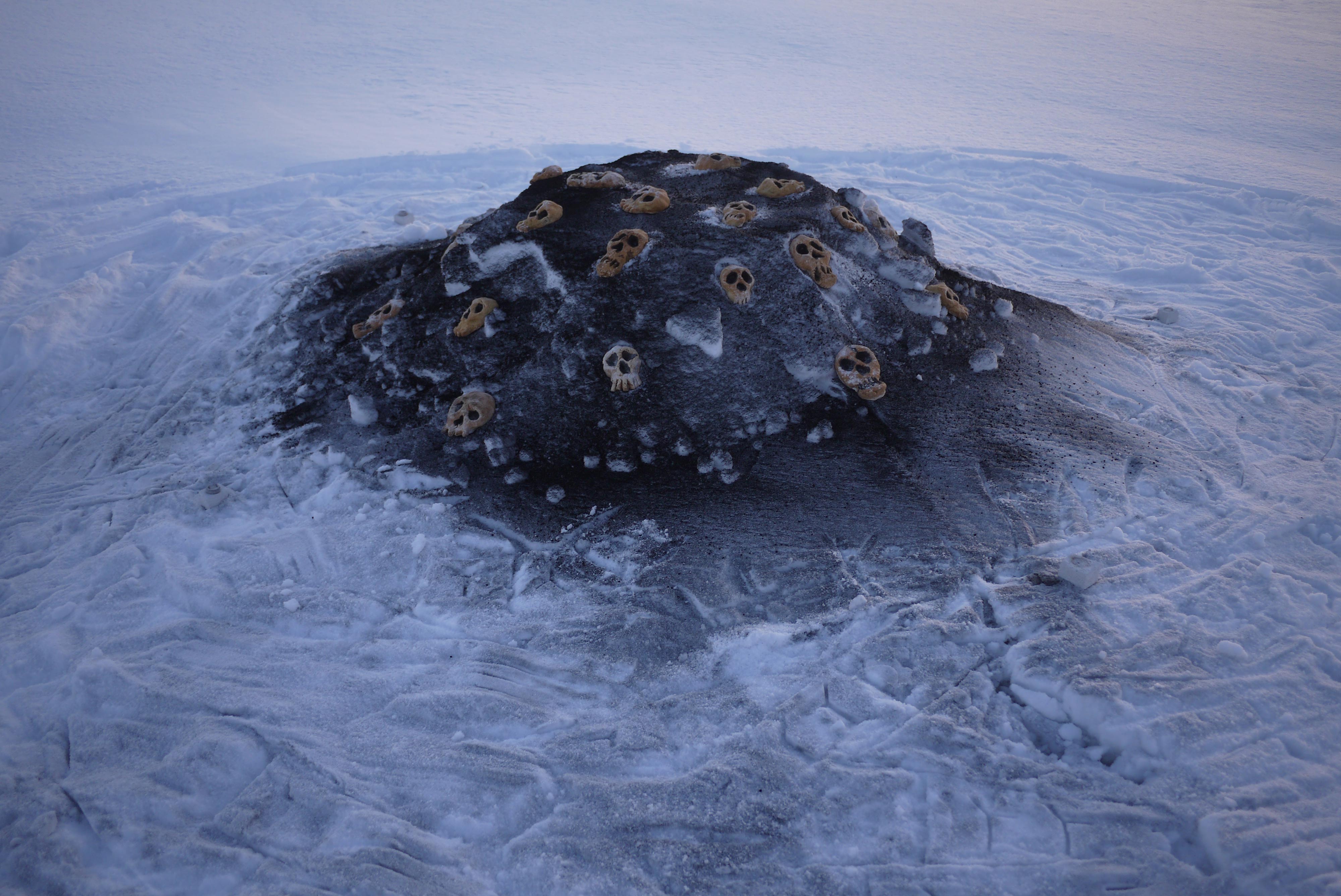 The story of creating this exhibition and the resulting images of this magnificent frozen world, the spine-tingling sublimity of its vast bleached expanse, which so few people will ever get to see, are all so spectacular, it’s perhaps inevitable that they would overshadow the artworks themselves. Some of them are wholeheartedly forthright interpretations of the theme. For instance, Montreal-born, Berlin-based artist Nika Fontaine offered a mound of active charcoal, like an extinguished funeral pyre, studded with cartoonish human skulls formed out of bread, with smoke wafting from burning frankincense. “It is only fair of you [Earth] to put an end to our selfishness . . . I welcome your wrath as an act of self-care and preservation,” Fontaine writes in an accompanying letter. There’s also Berlin-based Veit Schütz’s Aggregat Weltenbrand (Aggregate World in Flames) (2017), an old-fashioned, lacquered wooden radio equipped with a glowing 3D print of the planet Earth. In the original iteration of the artwork, the viewer could depress a red button to ignite a series of explosions across the miniature world. (A GIF on the exhibition website shows what this looks like, but the actual work installed on the ice floe is an “environmentally friendly” copy, sans electronics.)