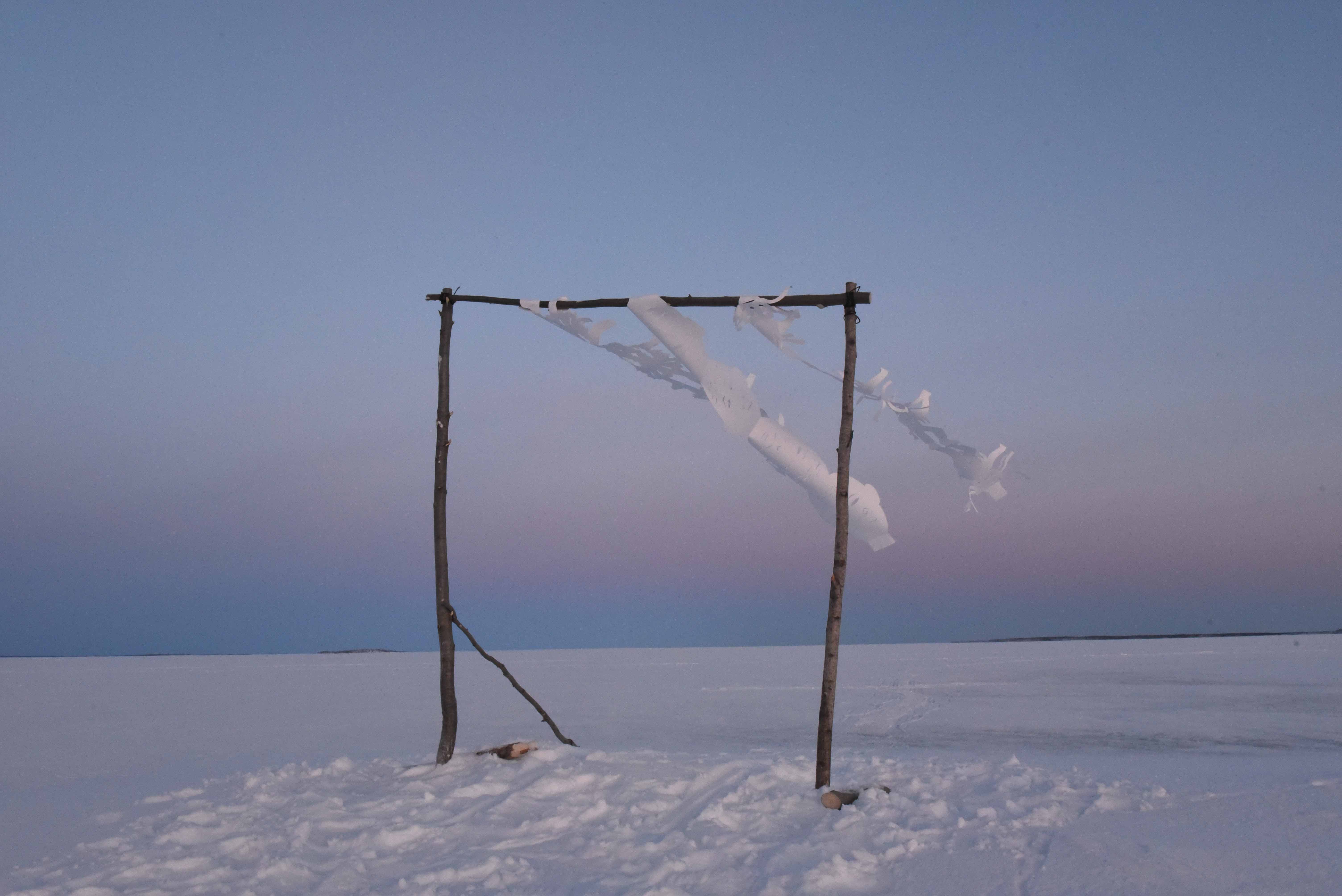 The more absurd, puzzling contributions also looked a little forlorn against the brilliant snow. French-Indian artist Nadira Husain’s Scrupulous (2020) is a clay turtle, of the commercial garden-gnome variety, that has been painted in periwinkle acrylic. In Hinduism, the turtle is an incarnation of the god Vishnu, who is charged with guarding creation; but Scrupulous is also, somewhat inexplicably, a nod to The Smurfs, Husain says. And Athens-based artist-collector Peter Niemann sent to the arctic Joseph Beuys’s legendary felt suit, slightly altered with the addition of a Marlboro patch to the jacket pocket; against a heavy purple sky, the empty suit drifts listlessly and inscrutably from the apex of a stick pyramid.