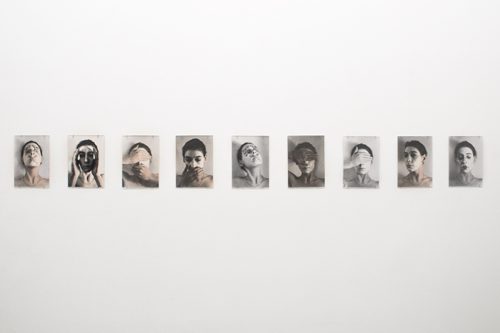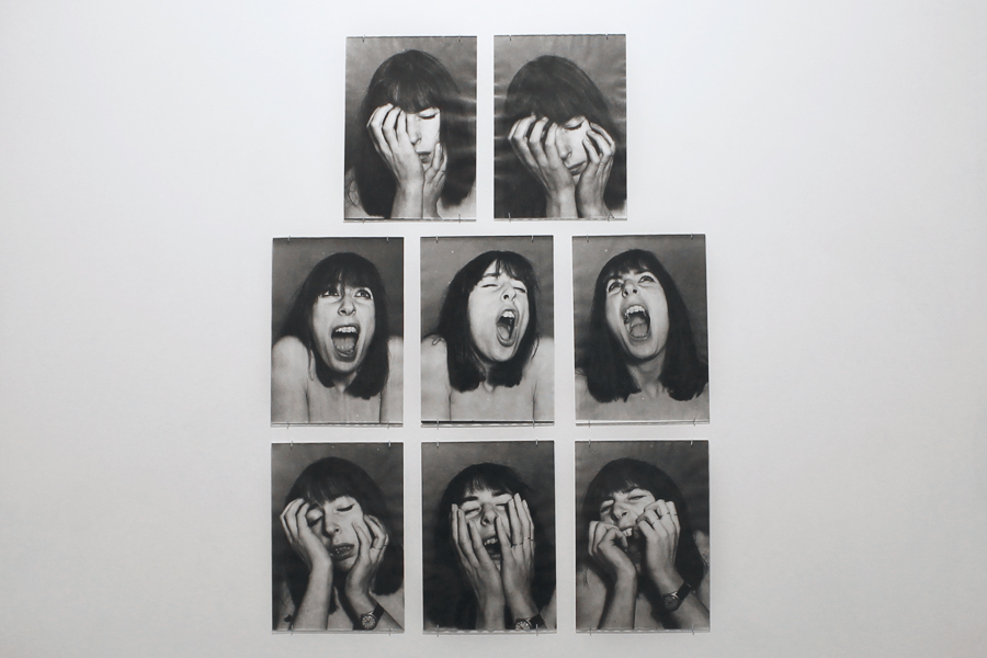 The images on view are all of Guy posing for herself in ways that, the press release insists, are meant to disrupt the male gaze. Such is presumably the aim of the first work the viewer meets, an untitled series from 1976, arranged in an unstable grid of nineteen gelatin silver prints, read from the upper left corner down to the bottom right, like a page in a book. Guy’s face is painted a clownlike white, her wide dark eyes looking into the camera with a gentle affect. From photo to photo, black X’s start to mark her cheek, her chin, her forehead, getting larger and larger, until her entire face is scribbled out, only her calm, unblinking eyes remaining legible. Further in the room, another series of four images from the same year shows Guy making herself cry, and elsewhere again, screaming and contorting her features in mock rage. Throughout the show, her face is treated like a plastic material prime for rearranging.