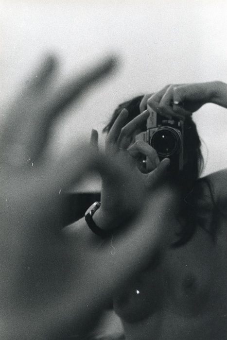 Her hands are important, too, like when she makes a frame with the OK sign, thumb and forefinger pinched together in a circle through which she aims her camera in a series of eight photographs from 1979; it reminds me of a kid’s impulse to hold their fists up to their eyes like pretend binoculars and peer through them, trying to tighten their focus on a world that’s too big. That childish playfulness is also seen in five photos from 1977 in which Guy lays back, her eyes closed, enjoying a sunbeam, while she casts abstract shadows over her face and neck with her hands or camera—only here there’s also something casually menacing lurking under that playfulness, the shadows sometimes looking like a cage or a muzzle locking over her mouth, some sort of weapon pressing down on her neck.