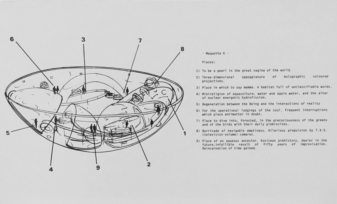 “EL HOMBRE NO HA DE TERMINAR EN LA TIERRA,” Gyula Kosice ardently declared in 1944. Man is not to end on earth! The Argentine artist continued to dream of liberation from the tyranny of soil and gravity until his regretfully earthbound death in 2016. Kosice’s program for an air-born exodus from tellurian existence is now on view in Mundos Alternos: Art and Science Fiction in the Americas at the Queens Museum, where it keeps company with over sixty other artworks that use that pulpy genre as fuel for jet packing to planes of experience estranged from accepted reality.