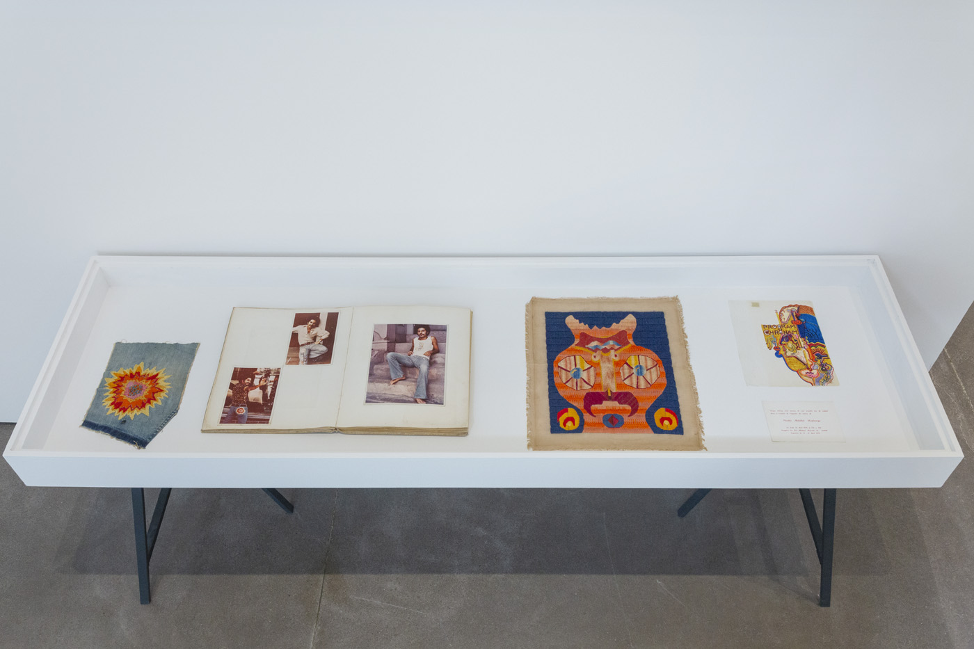 As Alexandria’s status as a cosmopolitan metropolis was waning, Beirut’s was blossoming: Moufarrege grew up in a richly diverse city that was a hotbed of cultural activity. He didn’t immediately take to the arts, though, instead pursuing chemistry at college. The first works encountered in Recognize My Sign were actually made in the US—in 1968 he was awarded a Fulbright to do his MA at Harvard. In a 1973 interview with Etel Adnan, Moufarrege explained that one day in Cambridge he got a hole in his blue jeans and sewed a strawberry patch to cover it. Then he decided to make another patch, based on a favorite Salvador Dalí lithograph of a flower sprouting butterflies from its stem. From there he began needling small embroideries for friends. Such patches and little scraps greet the viewer upon entering the gallery, placed on a table under glass; the fragile psychedelic fancies presage the conceptually sophisticated work to come.