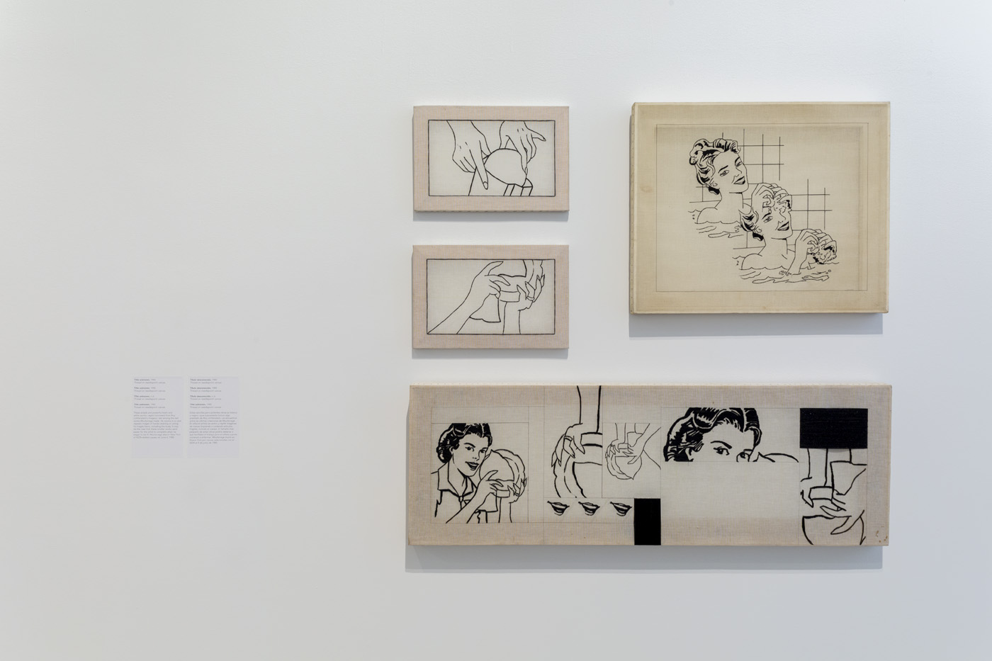 The show ends with four of the last pieces Moufarrege made, in 1985: commanding black-and-white embroideries also based on Lichtenstein’s art, but this time isolating out fragments of women cleaning—efficient, austere outlines depict hands washing dishes, squeezing a sponge in the bath. He was preparing for a solo show at FUN Gallery—it was his greatest dream to exhibit there, Ricard wrote, to join the ranks of Jean-Michel Basquiat and Fab 5 Freddy. Moufarrage was too ill to attend the opening, and died on June 4, 1985, at the age of thirty-seven, of complications due to AIDS. His was one of the first cases in New York City—he struggled to find a hospital to take him in, and was mistreated in the one that finally did. “I went to the opening, Nicky,” Ricard wrote in the artist’s Village Voice obituary. “It was a smash. All of New York is clamoring for your work.”