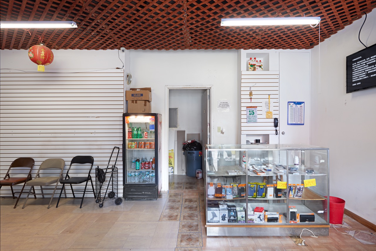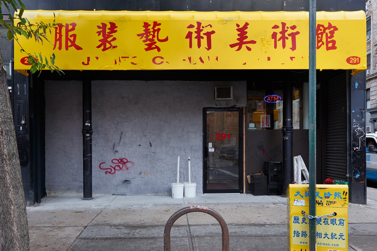 Next comes the trick of an authority figure telling you what you’re looking at. I imagine that many of the visitors are English-speaking art tourists coming to the fringes of Chinatown on the gallery circuit, and are likely already familiar with Fast’s maneuvers (and have probably read the press release online). But for those whom the artist perceives as “local,” there is a statement written in Chinese characters displayed on an LCD screen mounted high up on the right-hand wall. Along with some rather flat-footed, ambivalent art-world gesturing toward the process of gentrification, the statement informs them: “This space is not real. It is a gallery exhibition space.” (It must be noted that the simulated shop isn’t only confusing for Chinese-speakers. For a first-time visitor to the gallery such as myself, the set-up was disorienting to the point that I missed the exhibition altogether the first few times I walked by, until, with mounting panic in my chest, I peered in through the glass door and noticed a fancier-than-usual computer where a cash register should be.)