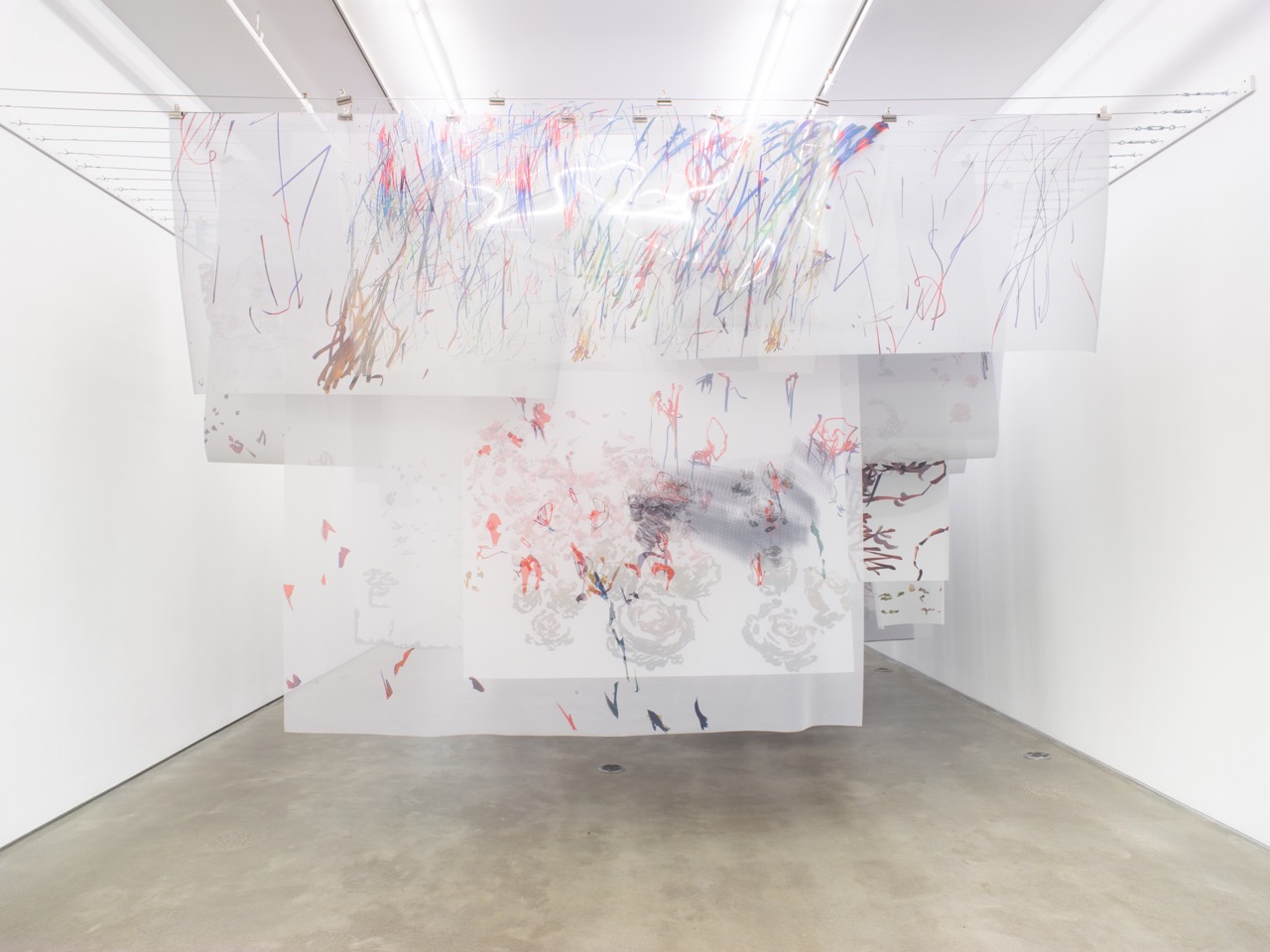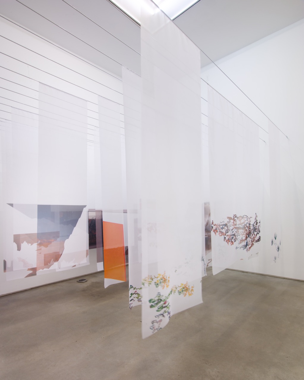 This is also to say that the work is hard to see. In the first room, facing the installation head-on, the thickly opaque sheets block the ones behind; only a few layers can be glimpsed at once. The sheets are hung close together, so that one has to crane and peer to view the images printed on them. Or they are hung so high up that one has to concentrate to make them out. I found myself using the camera on my phone to gaze bionically, zooming in through my screen on details that were difficult to otherwise descry. The images in question make up a field of isolated painterly gestures: a commotion of shaky lines on one panel, a smudge of repeated marks made using a special Photoshop brush on another. Some layers are simply flooded with color: a hit of toxic orange or strip of lucent blue. There are also found photos manipulated in different ways—grayscaled clusters of roses, a collaged wall of rocks. Passing through the room, all the different marks and icons come in and out of focus, merge and separate in your field of vision.
