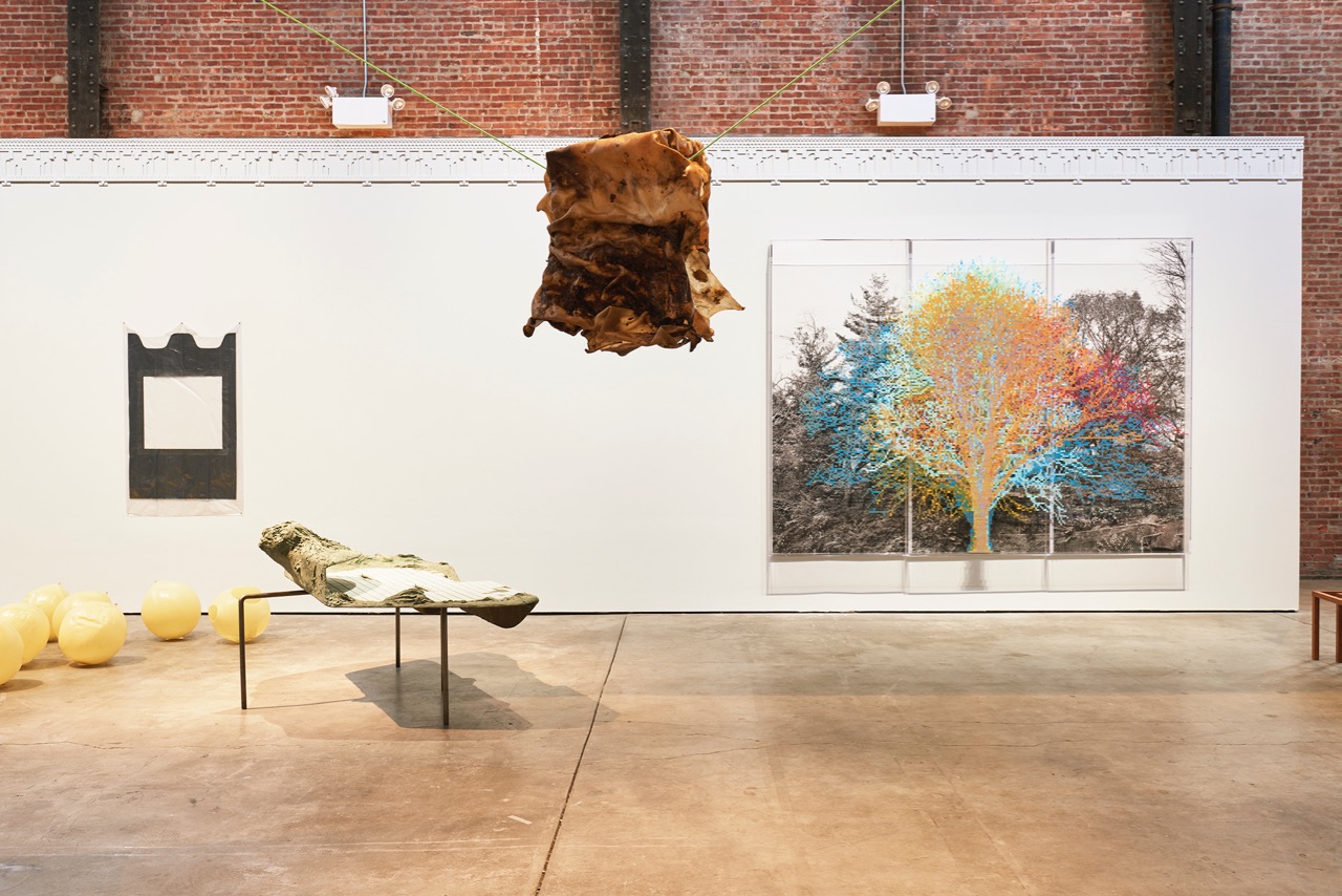 It takes careful and attentive listening to hear nothing; likewise, the exhibition as a whole requires careful and attentive looking, which sometimes involves a hunt for the artwork indicated on the exhibition map—another form of erasure, perhaps: the obviation of how we’re used to looking at an exhibition. Back downstairs, I stupidly wandered up and down one of the labyrinthine basement’s corridors, hunting for Rafael Domenech’s Tactics for a new architecture (excerpts from Severo) (2019), until I finally noticed one wall was discretely covered with a white Styrene skin. I didn’t think to gaze upward, but instead had to be told that the artwork continued on the ceiling, where vinyl letters are stuck onto long tubes of harsh fluorescent lights to create a poetic and oblique narrative in Spanish and English (these lightbulb-poems are also found at the top of the stairwell going back to the first floor). Also on the first floor, a glazed pottery by ektor garcia (tocado, 2019) hides atop a doorway; and way up high, close to the soaring ceiling, a sensuous piece of dirt-smudged rawhide dangles from the clerestory windows: Rindon Johnson’s The stage is no place for the riot (ongoing). You have to look around and crane your neck and squint to see some of these artworks—there is no pretense of a neutral, standardized act of viewing. You are acutely aware of yourself as you try to see.
