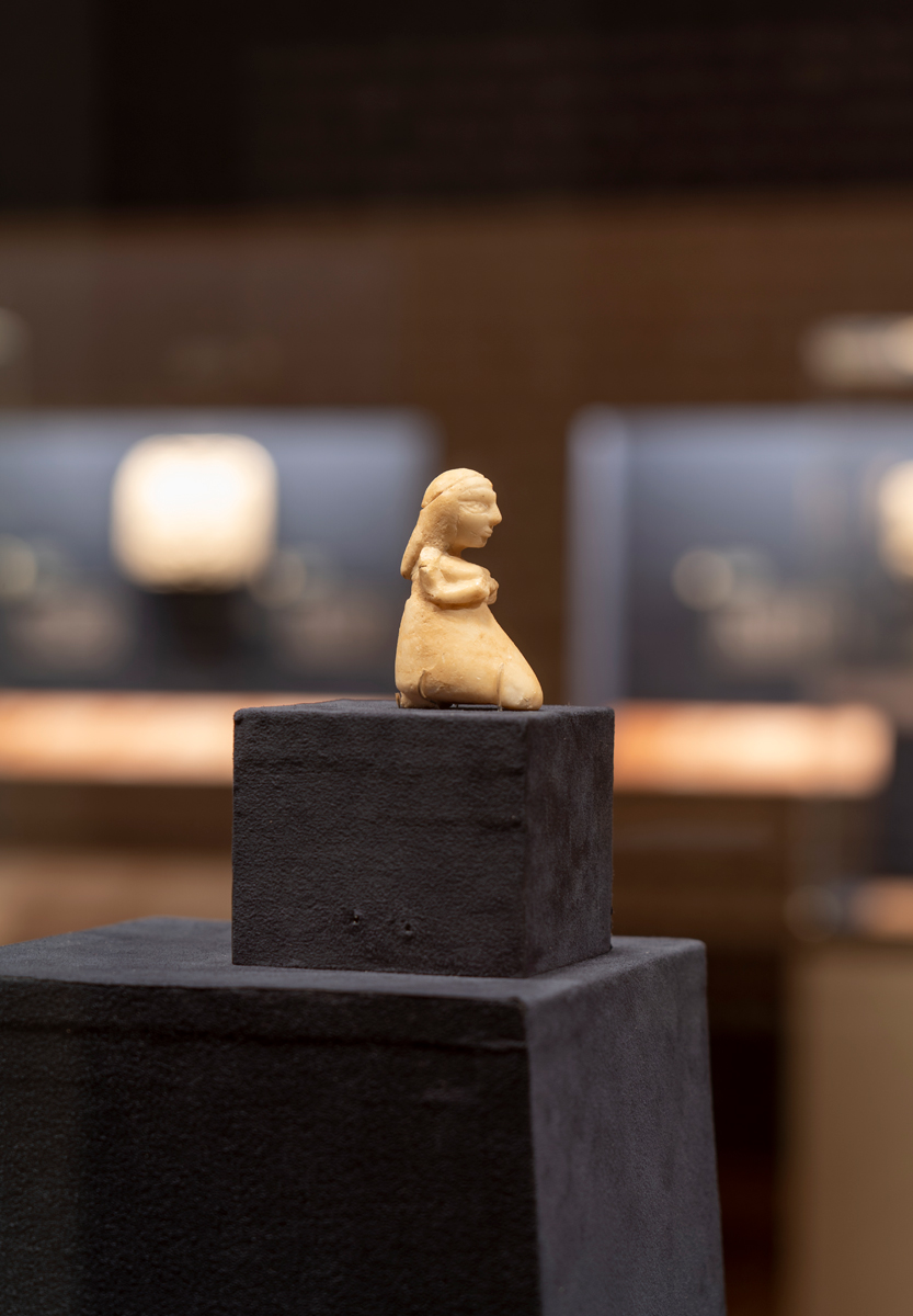 She Who Wrote: Enheduanna and Women of Mesopotamia, ca. 3400–2000 BC, installation view. Courtesy the Morgan Library & Museum. Pictured: kneeling female figure, Iran, proto-Elamite, Susa (modern Shush) Late Uruk period, ca. 3300 BC.