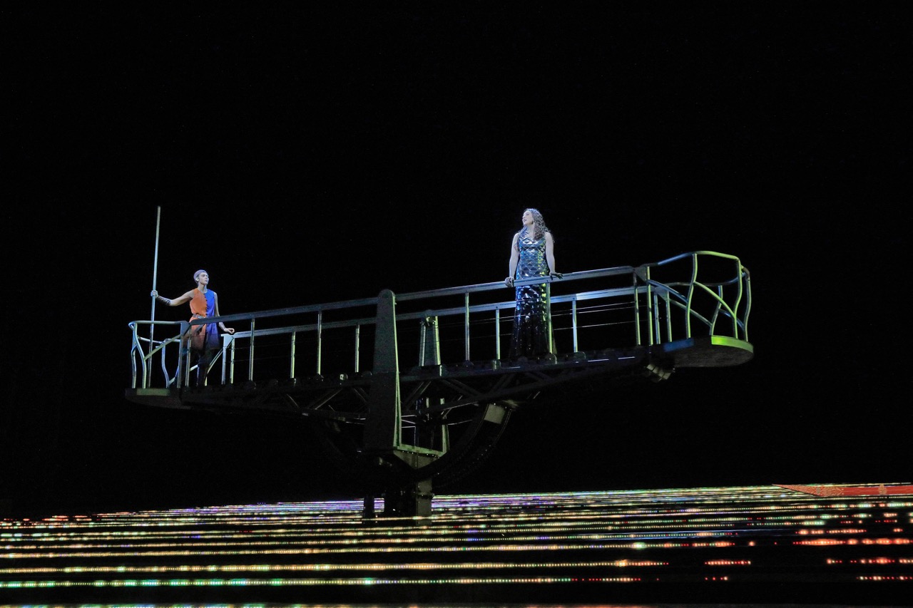 The biggest drawback of the production stemmed from the singers’ restricted ability to move about—a limitation all but dictated by the narrow, horizontal strips of ground between the strings of LED lights. For most of the evening, the characters were hoisted and twirled around, above that field of lights, on a large, swiveling machine that looked like a cross between a ship’s gangway and some platform on a movie spaceship. In Owens’s first scenes, he seemed a bit less powerful than I remembered him from past engagements, and I feared that Lepage’s intricate staging was cramping the singer’s style. Fortunately, before the first act was over, his performance had stabilized.