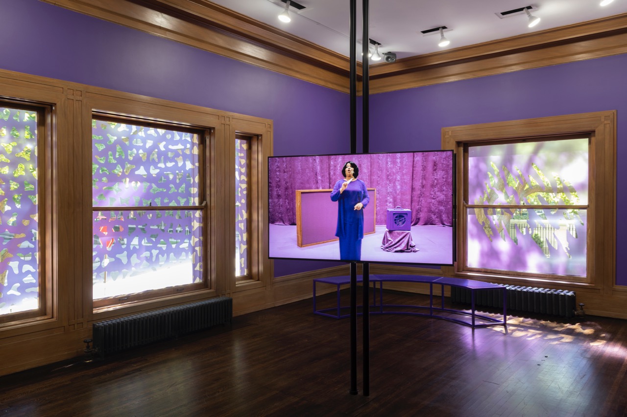 Incense Sweaters & Ice is also a cinematic installation that expands beyond one screen, one surface, one room. The film is split up scene-by-scene, each segment shown sequentially on one of three monitors that cannot be viewed from a single vantage point. Watching the movie thus requires the viewer’s near-constant movement, a situation that annoys not unlike the multitasking of contemporary life. It echoes Girl’s geographical journey, itself a reversal of the Great Migration, when African Americans of the rural southern states moved to the cities of the north and west. But mostly the piece expands by way of the color purple—yes, as in Alice Walker’s 1982 novel about the life of African American women in the south in the 1930s, where purple is independence and pleasure, but bruises too. At the Graham, purple replaces the black screen in between the film’s scenes, paints the downstairs gallery walls and benches, tints the patterned window filters, and does up Queen’s entire set and ensemble. If you don’t get this color, perhaps try harder.