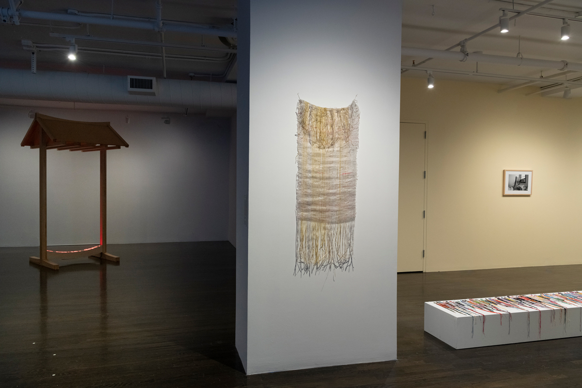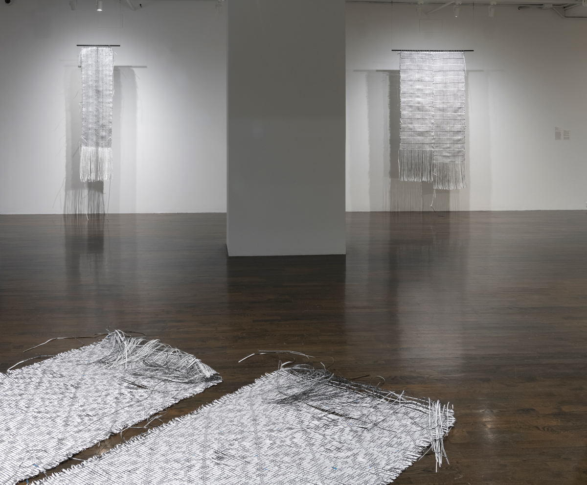 Bang Geul Han: Land of Tenderness, installation view. Courtesy The 8th Floor. Photo: Adam Reich. Pictured: Warp and Weft #05, 2022 (detail). Woven paper tapestry, metal rod, thread.