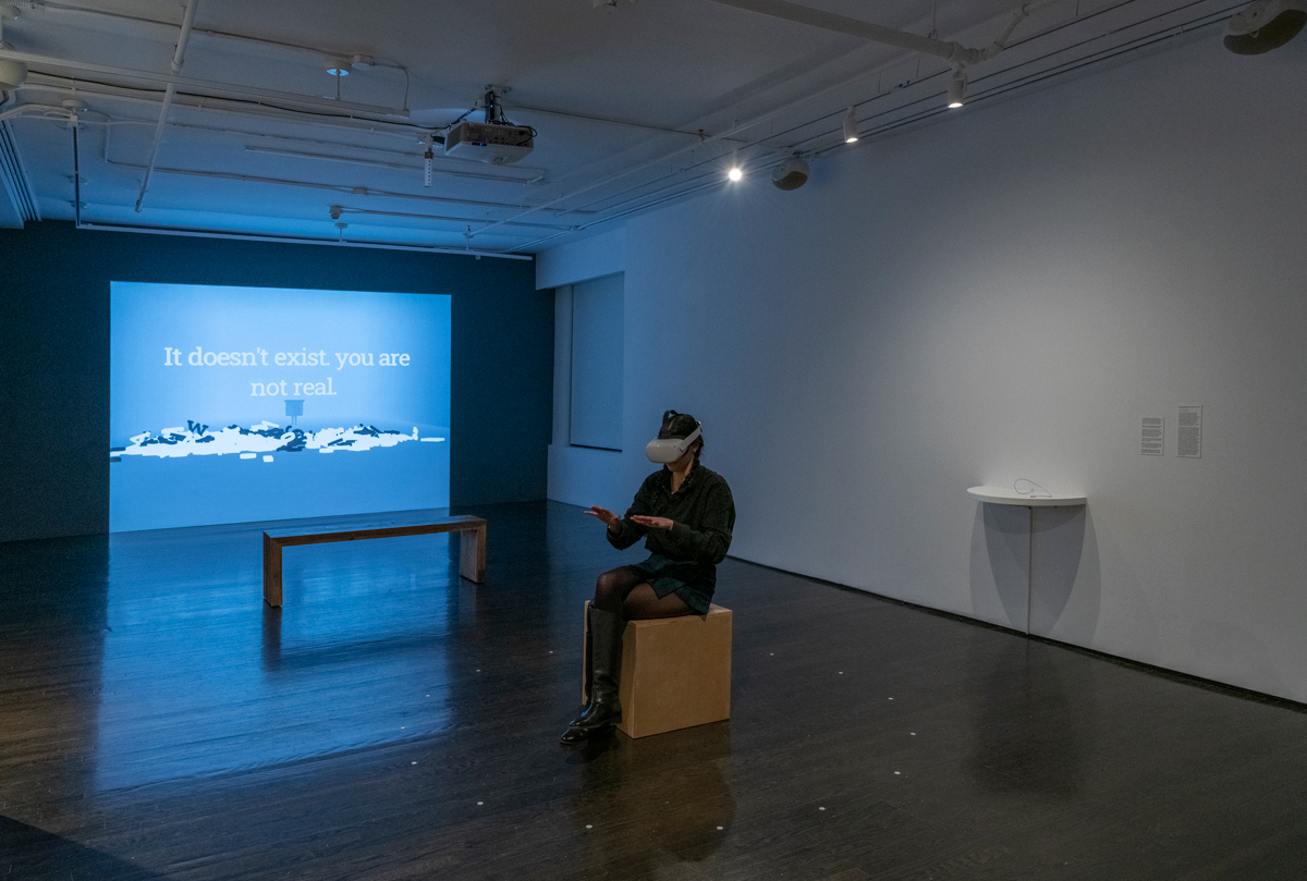The bracelets, weavings, and photographs support one another both thematically and aesthetically, as do their labels, making them intertextual in the truest sense. But two videos and two VR works also displayed in Land of Tenderness feel like a distinctly separate body of work. Their aesthetic vocabulary is radically different, and it’s more challenging to engage with them without resorting to the wall text, the opposite of how I had felt with the object pieces, which are complicated by their labels but not dependent on them. The VR project after which the exhibition is named, Terre de Tendre (Land of Tenderness) (2023), is shown on a Meta Quest 2 headset. It begins in a room where the user can pick up objects, such as a TSA-approved luggage bin, coming down a conveyor belt. The interactivity is limited and tricky to figure out without directions. Next, the room breaks open and the user is floating in a seascape surrounded by enormous mountains coated with what appears to be stock footage of, e.g., manicured hands cleaning a teakettle; there’s also flying Word-art-style text (“DANGEROUS SEA”) and what I learned is a theme-park soundtrack. I got nauseated (as an extra wall label warns might happen) and had to take a break. I suppose this is appropriate for an artwork that (the wall text implies) reflects the terror and disorientation of forced migration. The text also explains that the project is inspired by the Carte de Tendre, an “allegorical map created by a group of women in 17th century France, which charted the emotional path to true love.” While this is an awesome reference point that I recommend Googling, I can’t quite articulate its relationship to my firsthand experience in the headset.