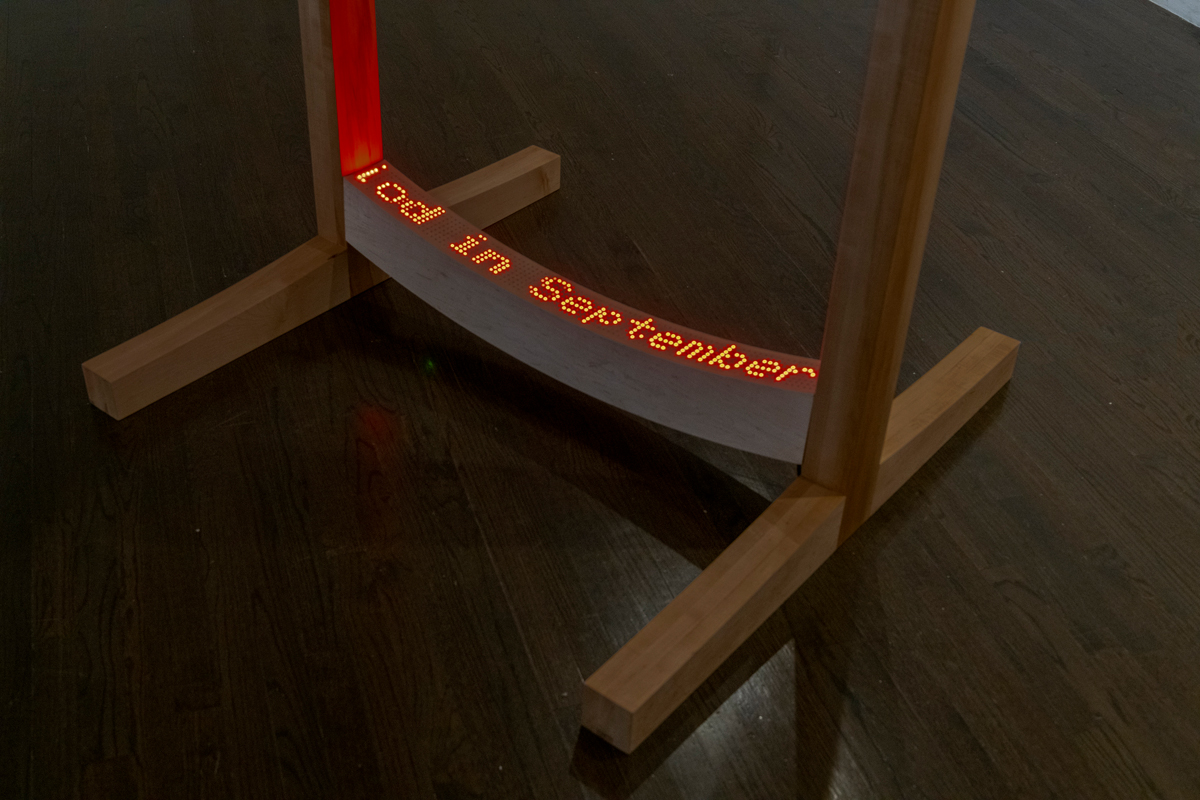 Bang Geul Han: Land of Tenderness, installation view. Courtesy The 8th Floor. Photo: Adam Reich. Pictured: Threshold, 2022 (detail). Wood, light pipes, aluminum, custom electronics, custom software.