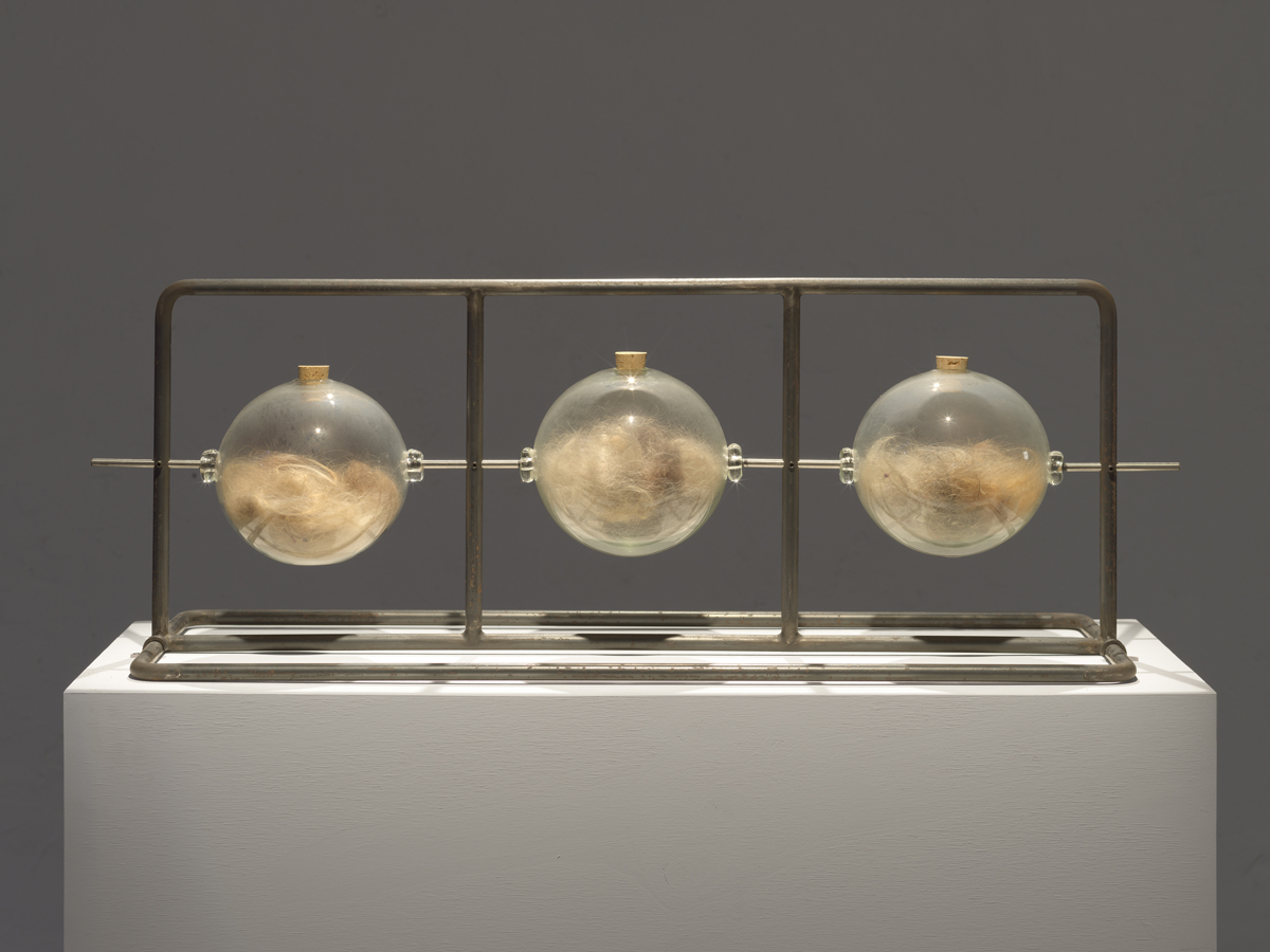 One dramatically spotlit work, Alchymical Wedding (1997–2012), consists of a steel frame with three blown-glass globes holding a collection of Breyer P-Orridge’s hair, skin, and fingernails. I find this piece, which is quite beautiful in a steampunk way, to be a microcosm of pandrogyny’s contradictions, ironies, and ambivalences. In he/r memoir, Genesis wrote that the art world is “a service industry to the rich,” and “it’s no mistake that art becomes valuable after an artist is dead.” And of the body itself: “There’s nothing sacred there. Nothing.” So, if the body is an irrelevant husk we are trapped in on the way to higher consciousness, and the art world is a bullshit place for rich people, why preserve fingernails for posterity? I wonder whether Breyer P-Orridge might respond by saying these things are not mutually exclusive: you can aim to transcend the body and also recognize the power of the body, and you can want to destroy the system while also wanting to be validated by it. Genesis could swallow this pill whole. Not everyone can.