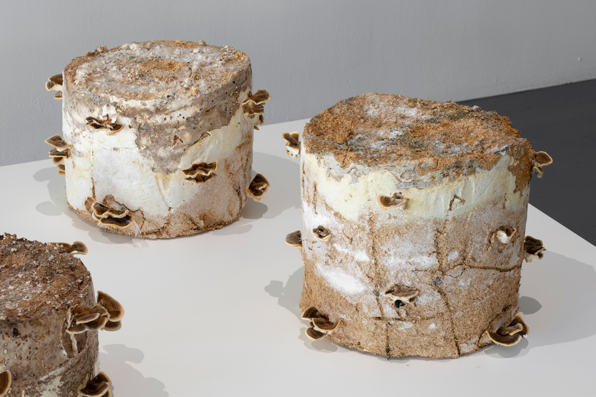 Nour Mobarak, Fugue II, 2019. Trametes versicolor, wood pellets, two speakers. Courtesy the artist and Amant.