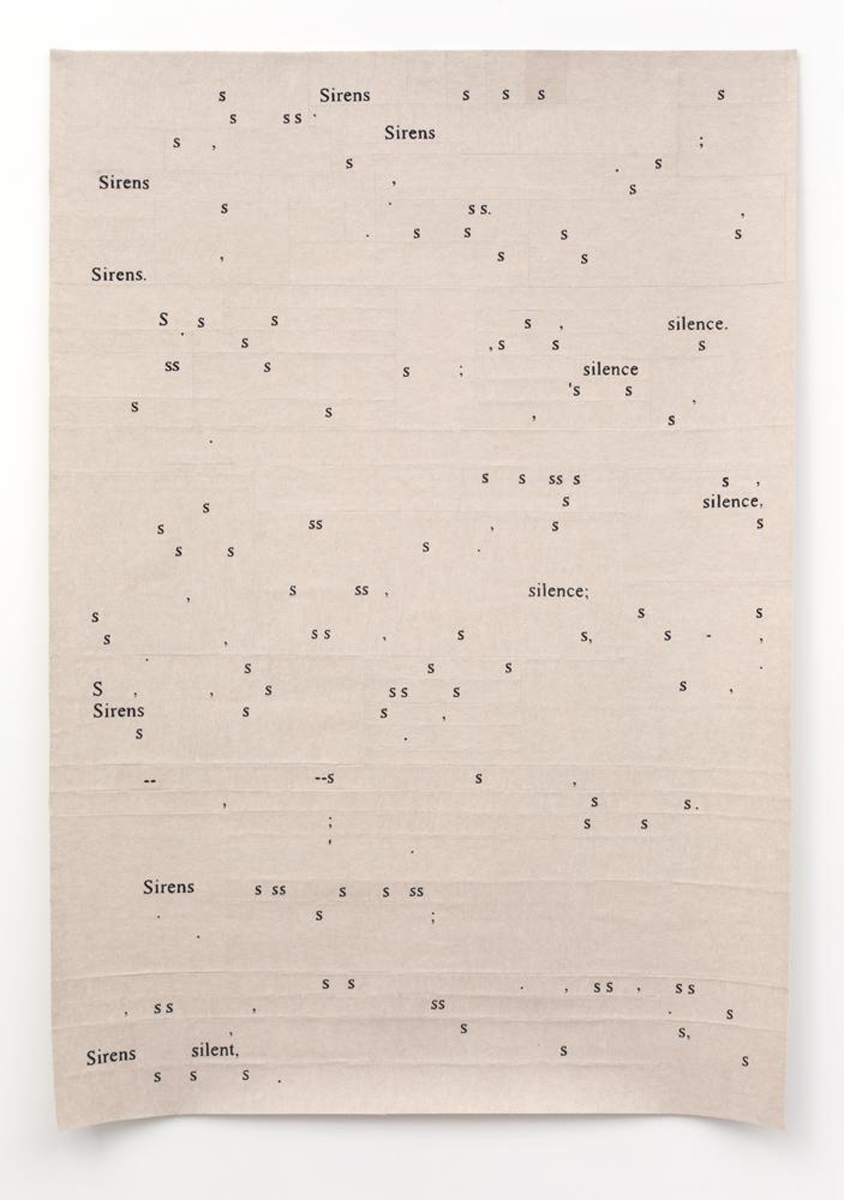 In a curatorial text introducing her group exhibition at Amant, SIREN (some poetics), critic and poet Quinn Latimer points out that in The Odyssey, Homer doesn’t describe the Sirens’ bodies; only in later translations and art were the creatures depicted as woman-fish or woman-bird amalgamations. It is the disembodied, eerie, seductive, not-quite-human voice that serves as a guiding logic—or illogic—for Latimer’s show, in which she aims to avoid the “cool, clinical, conceptual” methodology of typical exhibits dealing with language and poetics. But avoiding the rocks is one thing; navigating by the stars is another. Not only does SIREN reject the sterility (and pretension) of a certain literary-artistic tradition—words on a page, words on a wall—I found it produces a profoundly sensual experience in which reading, looking, listening, and moving become one.