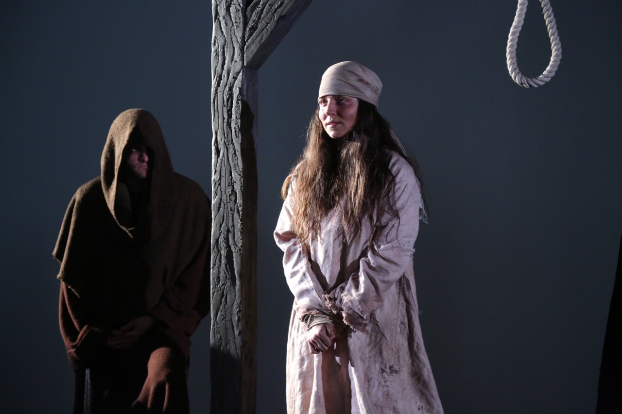 It would take a while to find out. Before the hanging proper, the audience was ushered into pre-show holding rooms, where period-dress wenches served sausages and beer. Hay bales, lit by flickering fake candles, provided the seating. But soon enough it was time to move. The drums sounded, the condemned appeared with her executioner, and the procession to the gallows began. An overzealous audience member shouted “string her up.” Uncomfortably, I fell in line.
