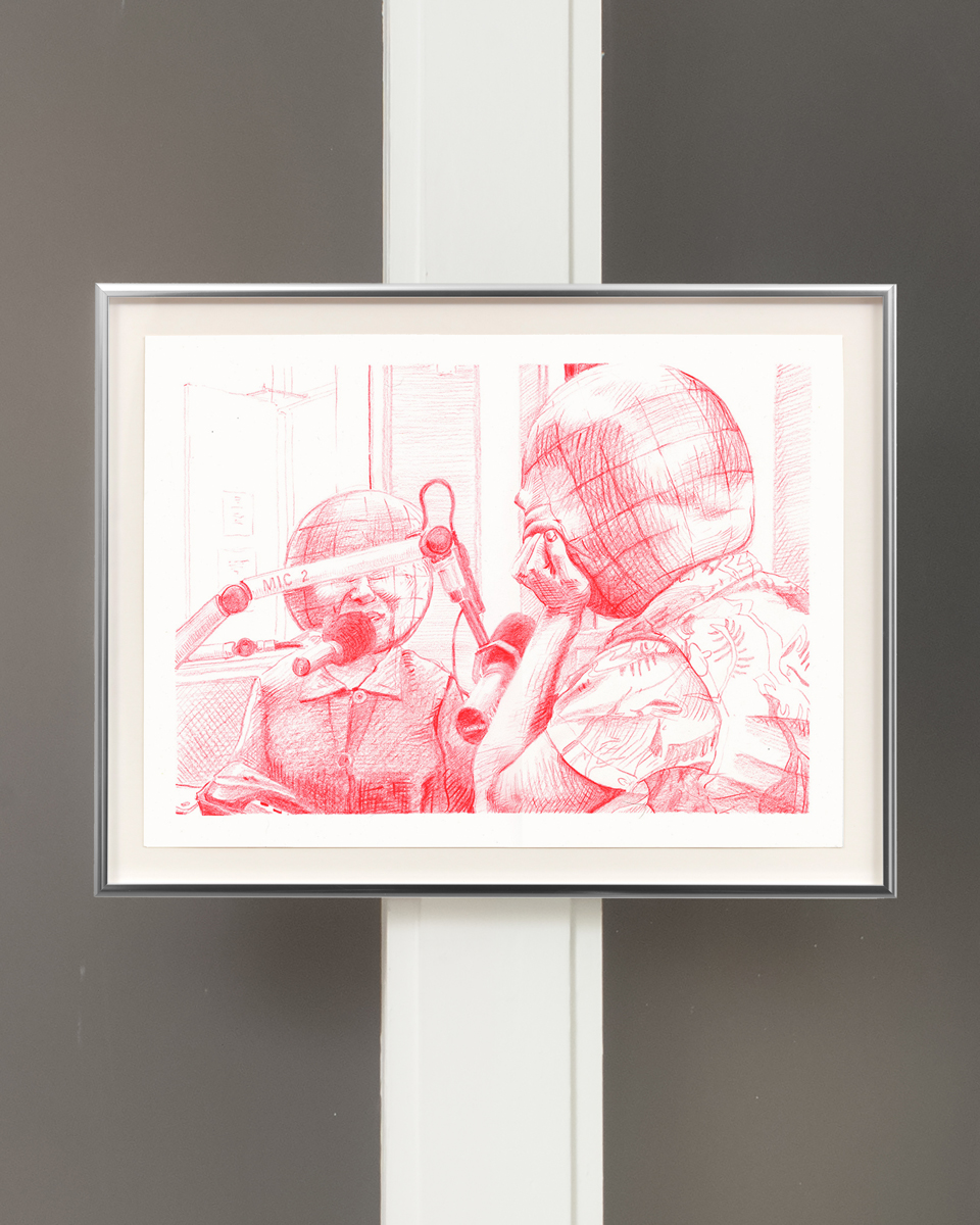 Another drawing shows two people talking in a radio studio, the diagonal of a mic boom slashing across one figure’s face, while the other props his chin on his hand and turns his back to us. I can only imagine the source to be a photo illustration for a magazine story, “artily” or just plain poorly composed. The setup seems to date to the later ’80s or ’90s. Perhaps it’s the Hawaiian shirt the interviewer wears; perhaps it’s the fact that those years mark the beginning of the talk-radio era, in which reactionary conservatism began to take over the American airwaves. Rush Limbaugh went national in 1988.