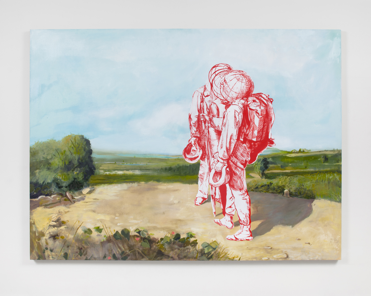 David Muenzer, Trio (The Meeting, or Hello!), 2022. Oil on linen, 52 × 72 inches. Courtesy the artist and Dracula’s Revenge. Photo: Jason Mandella.