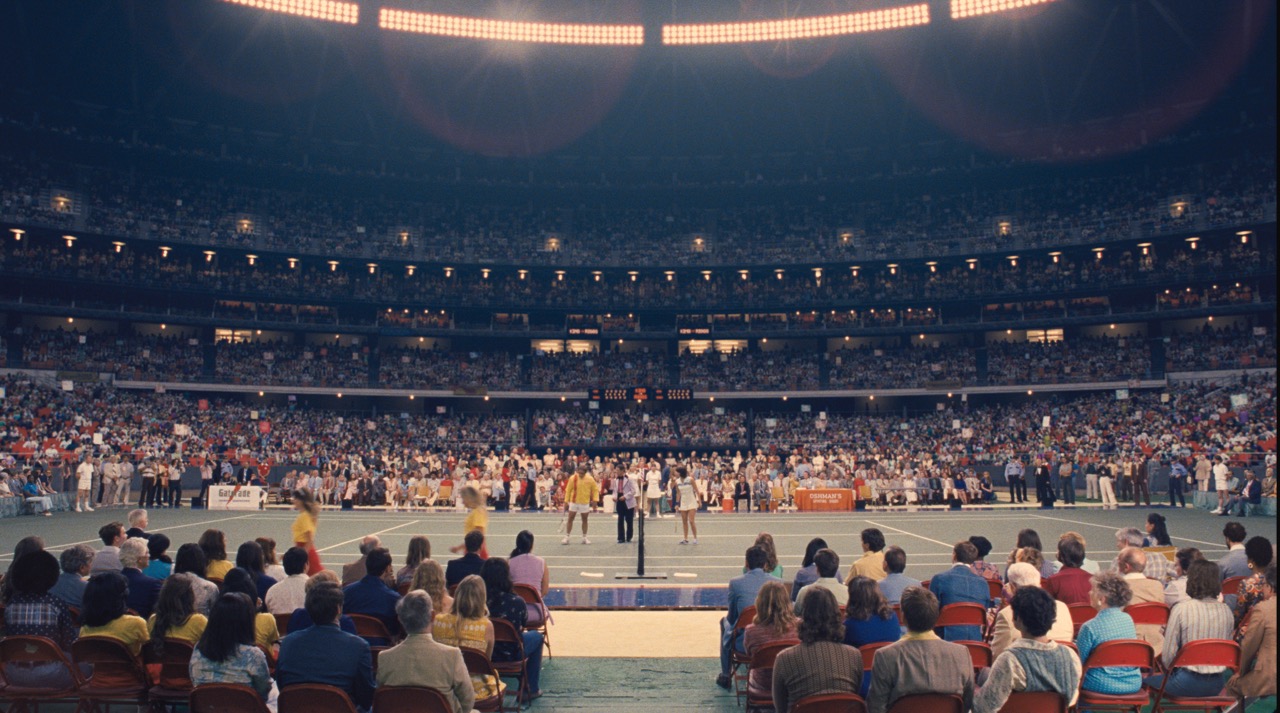 Riggs, now jokingly calling himself “the number-one ladies’ player,” challenges King again, this time for a $100,000 purse. BJK realizes she must agree to participate in this clown’s circus—to redeem her gender, to secure and promote the tour she helped found (which would become the Women’s Tennis Association), to prove a point. As staged in the film, the match, which took place on September 20, 1973, in the Houston Astrodome, is yet another instance of excessive replication, a spectacle doubled, most garishly when archival footage of Howard Cosell is repurposed to make him the screen partner of Natalie Morales, the actress who plays Rosie Casals, a tennis pro and pal of King’s who was a commentator during the competition.