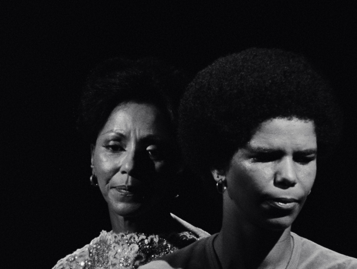 Billops and Hatch share directorial credit on five of their six films; the short Take Your Bags (1998), for which she is the sole auteur, finds Billops wryly riffing on slavery and cultural theft to an exceptionally attentive little boy, a distant relative of hers. Despite this joint authorship, Billops was the catalyst behind many of their works, which often draw upon her own family’s history and frequently feature her—a vivacious figure with elaborate eye maquillage and a strip of hair above her upper lip—in front of the camera. Suzanne, Suzanne (1982), their first film, centers on Billops’s niece, who matter-of-factly recounts her past heroin addiction, her multiple arrests, and the merciless physical abuse she endured from her father, dead since 1968. Suzanne is not the only one interviewed; Billops extends her inquiry to Suzanne’s older brother, Michael, and especially to her mother, Billie (Billops’s older sister), who recalls the “relief” she felt after her husband died but who had done little to stop him from beating their child. In this gutting film’s most wrenching segment, shot in high-contrast black-and-white, mother and daughter take part in a restorative-justice tableau: Suzanne, in the foreground, with her eyes cast downward, calmly asks her mom why she didn’t intervene—an interrogation that causes Billie, seated directly behind her child, to break down into a very real torrent of tears. (Two decades after this inaugural effort, Billops and Hatch would turn their attention to the respective sons of Michael and Suzanne in A String of Pearls, investigating how these now twentysomething men approached the responsibilities of young fatherhood.)