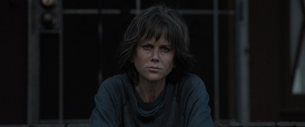 The ignominies Bell must endure during her crusade to requite the dead and allay her own festering conscience—as when a recently sprung convict, one of the miscreants she ran with in her FBI days, scoffs upon seeing her, “Jesus, you look old”—double as perverse tributes to Kidman for defiling her flawless face. There is precedence in the actress’s oeuvre for this kind of disfiguring: recall the ridiculous, wholly unnecessary prosthetic schnoz she wore as Virginia Woolf in The Hours (2002).
