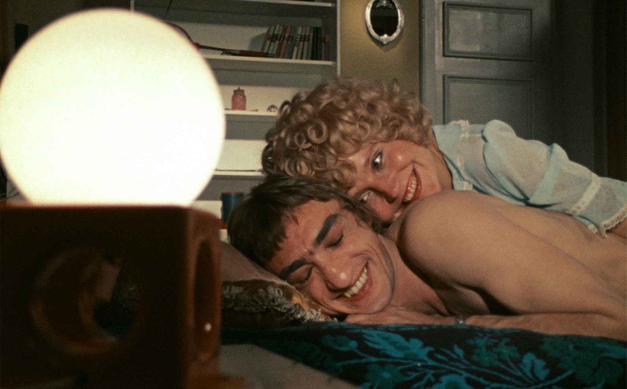 That celebration also occasions the circumstances for a thrillingly strange romantic first encounter. Dispatched to buy more bubbly for Oma, Jochen, while feeding marks into a champagne vending machine, starts chatting with Marion (Hanna Schygulla), who’s purchasing pickles from a similar automat contraption: the meet-cute becomes the meet-cuke. Although they form a somewhat class-discordant couple—Marion is the daughter of a civil servant and works in the classified-ad department of a newspaper—she is frequently the first one to rousingly remind Jochen and the six other members of his tool-making team of their rights as organized labor.