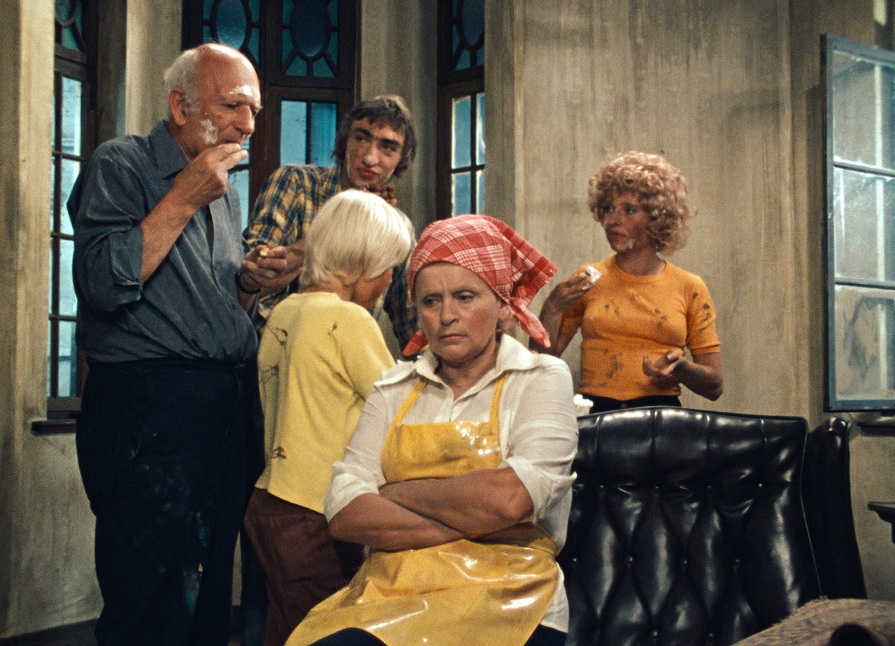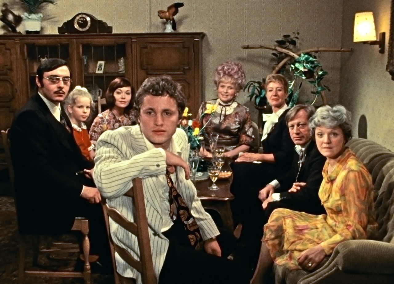 As RWF himself explained, the goal of the multipart drama (which, spritzed with slapstick and sight gags, is often very funny) was to upend “what people usually expect workers to be.” Fassbinder’s laborers aren’t doomed to abysmal lives: they are unalienated, committed to group action on the factory floor and to maintaining strong bonds with kin, lovers, and friends after punching out. The central figure of the expansive ensemble is Jochen Epp, played by Gottfried John, a lanky hulk with enormous facial features—his schnoz approximates the size of a beer stein—who suggests a Willy Brandt–era Adam Driver. An employee at a tool factory, he still lives at home with his parents and his beloved grandmother (Luise Ullrich); a birthday party for Oma (the German word for “granny” and the only name assigned to Ullrich’s character) opens the miniseries and introduces most of the principal cast.