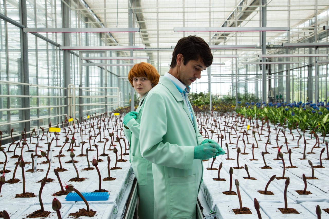 The opening scene crisply establishes this unmooring. We are inside the greenhouse of the British corporation Planthouse Biotechnologies, where the rigid order suggested by the tidy rows of flora is deranged both by what we hear—a tinnitus-like buzz followed by a doleful Japanese flute—and the movements of the camera, positioned overhead and slowly rotating 360 degrees. Senior breeder Alice (Emily Beecham) explains to her colleagues that she and her team have finally succeeded in genetically engineering a plant that emits a scent that makes its owner happy and fosters intense attachment. “You’ll love this plant like your own child,” she says to polite chuckles.