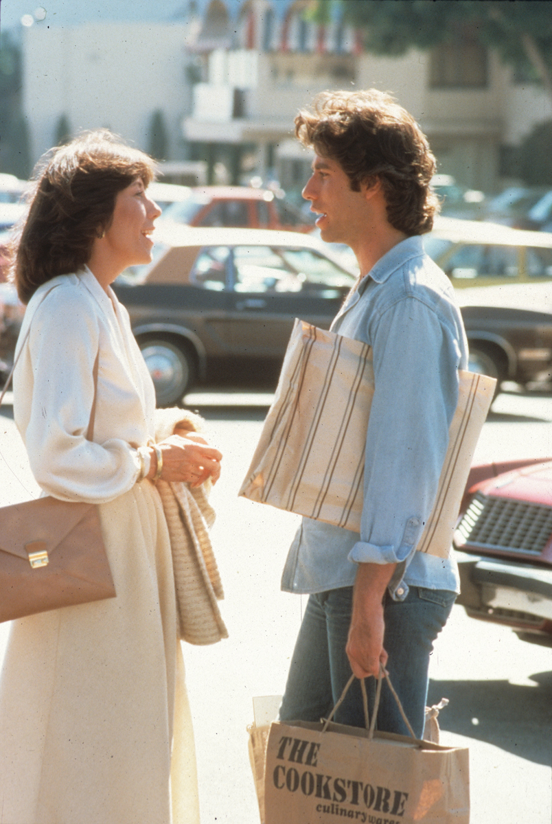 In this scene—a sequence of shot/countershots, in which, crucially, Tom and Linnea aren’t in the same frame—Tomlin brilliantly enacts heterosexual desire. That feat is never evidenced in Moment by Moment, a film that requires her and Travolta often to be within inches of each other. In its opening scene, Tomlin’s Trisha, bedecked in white silks and ecru linens, saunters down Rodeo Drive. The segment, scored to syrupy sax, plays as a sedate echo of Saturday Night Fever’s propulsive intro, in which Travolta’s Tony Manero swaggers down southwest Brooklyn’s 86th Street, the rumble of an elevated subway adding to the percussion of the Bee Gees’ “Stayin’ Alive.” (The showman Robert Stigwood, who managed that chart-topping sibling trio, produced SNF, Grease, and Moment by Moment.) During her stroll past blocks of high-end boutiques, Trisha’s mouth is slightly agape—a gesture that recalls Linnea’s in the Nashville scene described above yet here conveys not sexual appetite but stupefaction. Underscoring the off-kilter, narcotized state that Tomlin seems adrift in, her character’s first words in Moment by Moment are sadly all too apt: “What about the sleeping pills?”