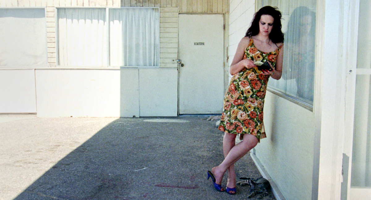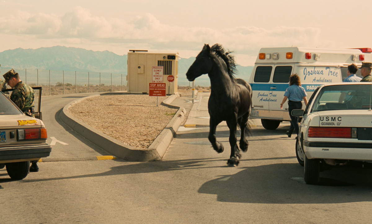 On the desert highway that serves as the primary setting of Menkes’s third feature, The Bloody Child (1996), three road signs appear again and again, halting all forward movement: stop, do not enter, wait here for the green light. But what if the green light never comes? In this film, inspired by the true story of a Gulf War veteran in Twentynine Palms who killed his pregnant wife and was found by fellow marines while digging her grave, a woman’s corpse brings progression to a standstill. Dispensing with chronology and embracing the hallucinatory potential of repetition, Menkes cycles through a series of moments surrounding an unrepresented death. Out of what feels like a frozen present, she carves a crystalline hell within which to anatomize the murderous boredom and routine aggression of both heterosexuality and the military. A girlish, disembodied voice floats across the film, laughing and babbling at the threshold of intelligibility, borrowing words from the Wayward Sisters of Macbeth and the Evil Queen of Snow White; the credits name her as the murdered wife, whose mutilated body is sprawled in the backseat of a car at the roadside. Grainy 16mm images shot in Egypt and Sudan intrude on the crisp naturalism of the 35mm Californian vistas, offering lyrical glimpses of inassimilable otherness. Within this strange and transfixing construction, Menkes’s insistent return to the traffic signs seems like a declaration of form as well as a warning to the viewer: give up on all assumptions about what a narrative film does, be prepared to tarry, know that there is nowhere to go but deep down into the film’s vertical trap.