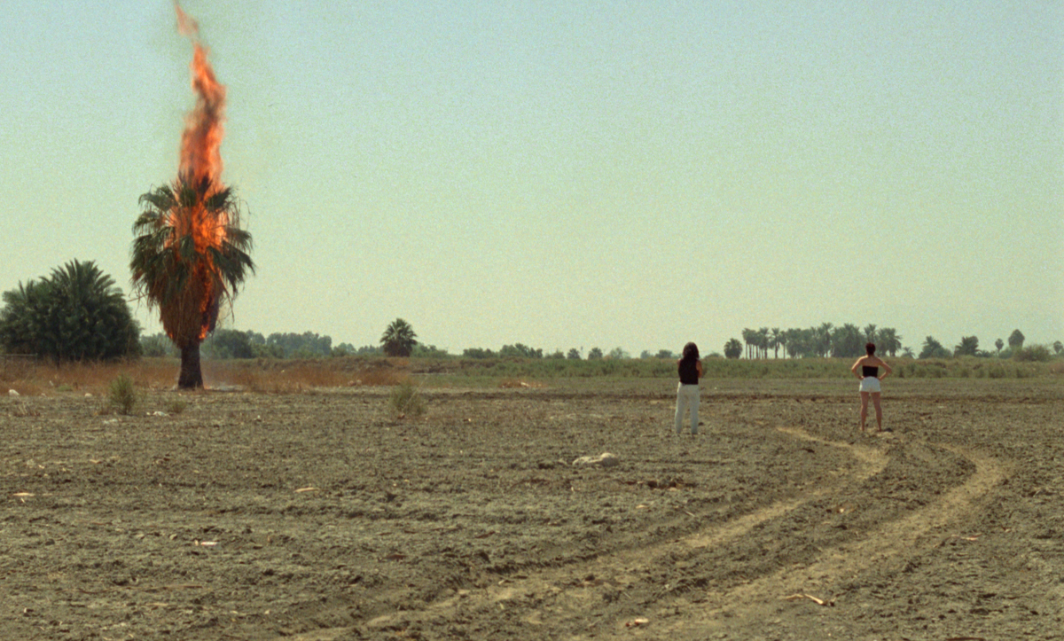 To be able to pin an interpretation like this, even tentatively, on one of Menkes’s images is rare. From the mid-length The Great Sadness of Zohara (1983) on, her fiction films are oneiric force fields in which sense and story wither in the face of sensation. Sometimes they advance legible symbolism, as in the multiple recurring shots of Lulu (Marina Shoif), the main character of Phantom Love (2007), stepping over a giant snake in a hotel corridor. But more often and more seductively, they push up against what Freud called the “navel of the dream”: “the spot where it reaches down into the unknown,” the point at which analysis falters. What could it mean, after all, to find a ring hidden inside a whole cooked fish, as the protagonists of both Queen of Diamonds (1991) and Dissolution (2010) do? For elephants to appear out of nowhere and sway in the night or for a lone palm tree to go up in flames? The African sequences of The Bloody Child resist being deciphered in relation to the Mojave murder in all but the most speculative ways.