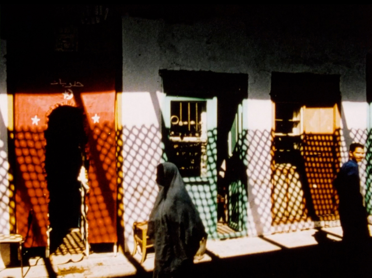Though individual shots in Carriage Trade are quite striking—I think often of a particular pan, arcing across a cluster of rooftops covered with cowhides drying in the sun—their character is always associative, shaped not only by those images that immediately follow and precede them, but also by the entire sequence in which they are embedded. So a shot might be bracketed by other, “neutral” shots, typically absent a human figure, allowing it a bit of breathing room, while serving variously, and sometimes simultaneously, as a complement or point of contrast to those further up and down the reel, both on the level of their content as well as their design. An elaborate web of correspondences thus emerges between different shot lengths, between different film stocks, between the movement of the camera and the movement within the frame, between the action in the foreground / middle ground / background, between shifting color schemes.