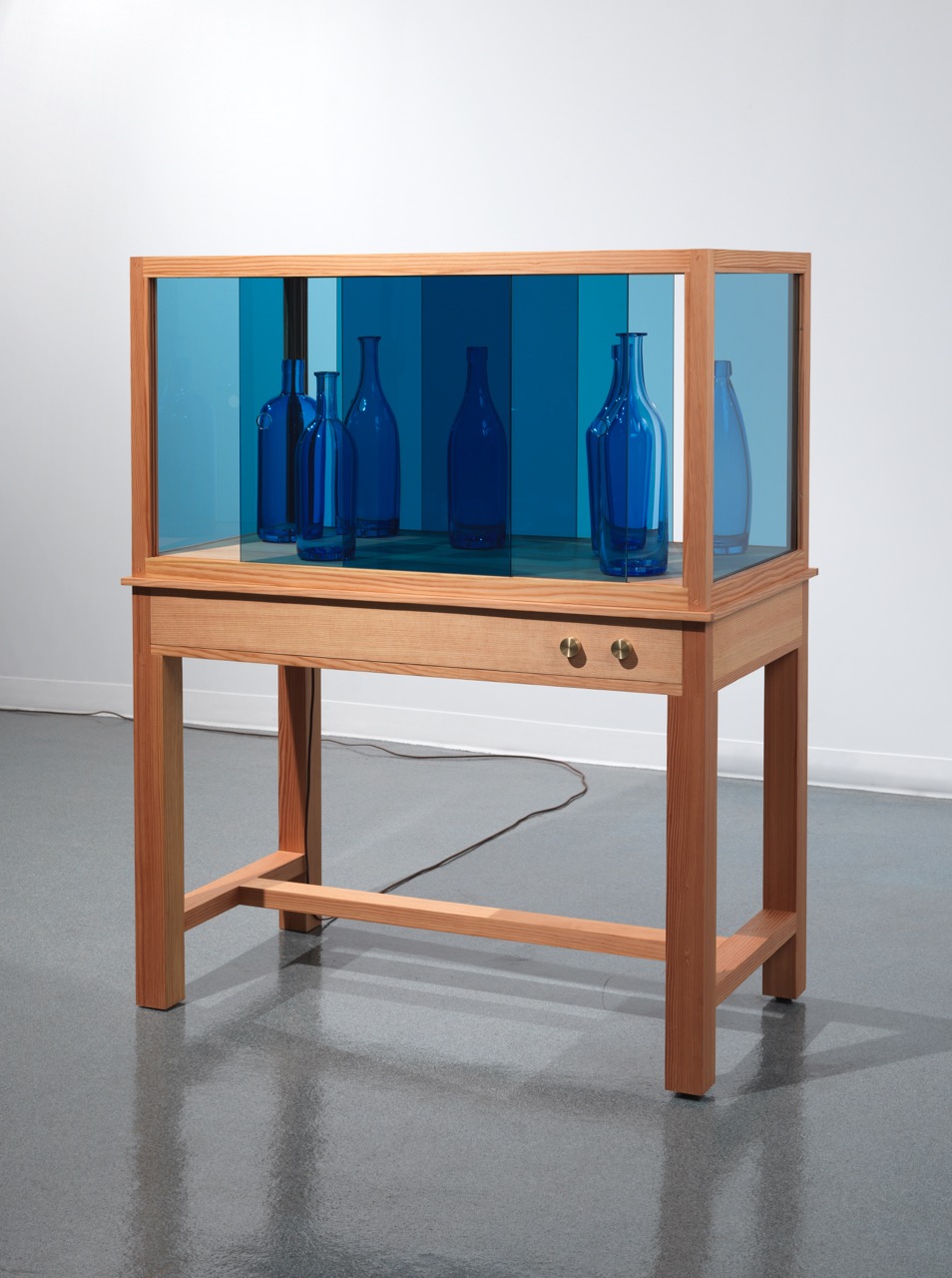As with friendship, so with romance. Near an exit sign stands Josiah McElheny’s still life brought to life. End of a Love Affair (2014) consists of seven blue glass bottles—more empties—inside a cabinet made of wood and more blue glass. A piece of furniture, with two brass knobs, wired for sound, possibly functional, it appears familiar and not. And then a song begins, a jazz number with a lilting bossa nova beat, and it’s telling you goodbye.