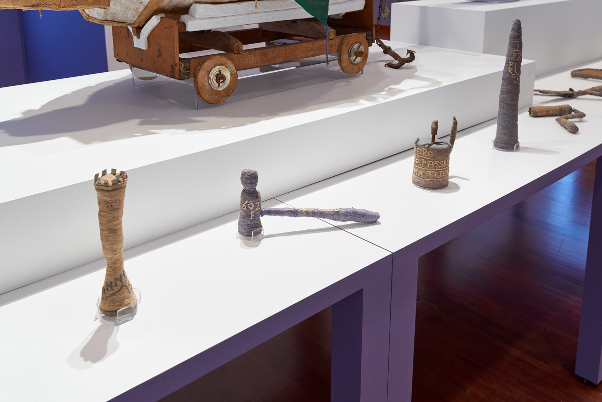 Bispo do Rosario: All Existing Materials on Earth, installation view. Courtesy Americas Society / Council of the Americas. Photo: Arturo Sánchez. Pictured: Untitled [Navios de Guerra (War ships)], (detail) no date.