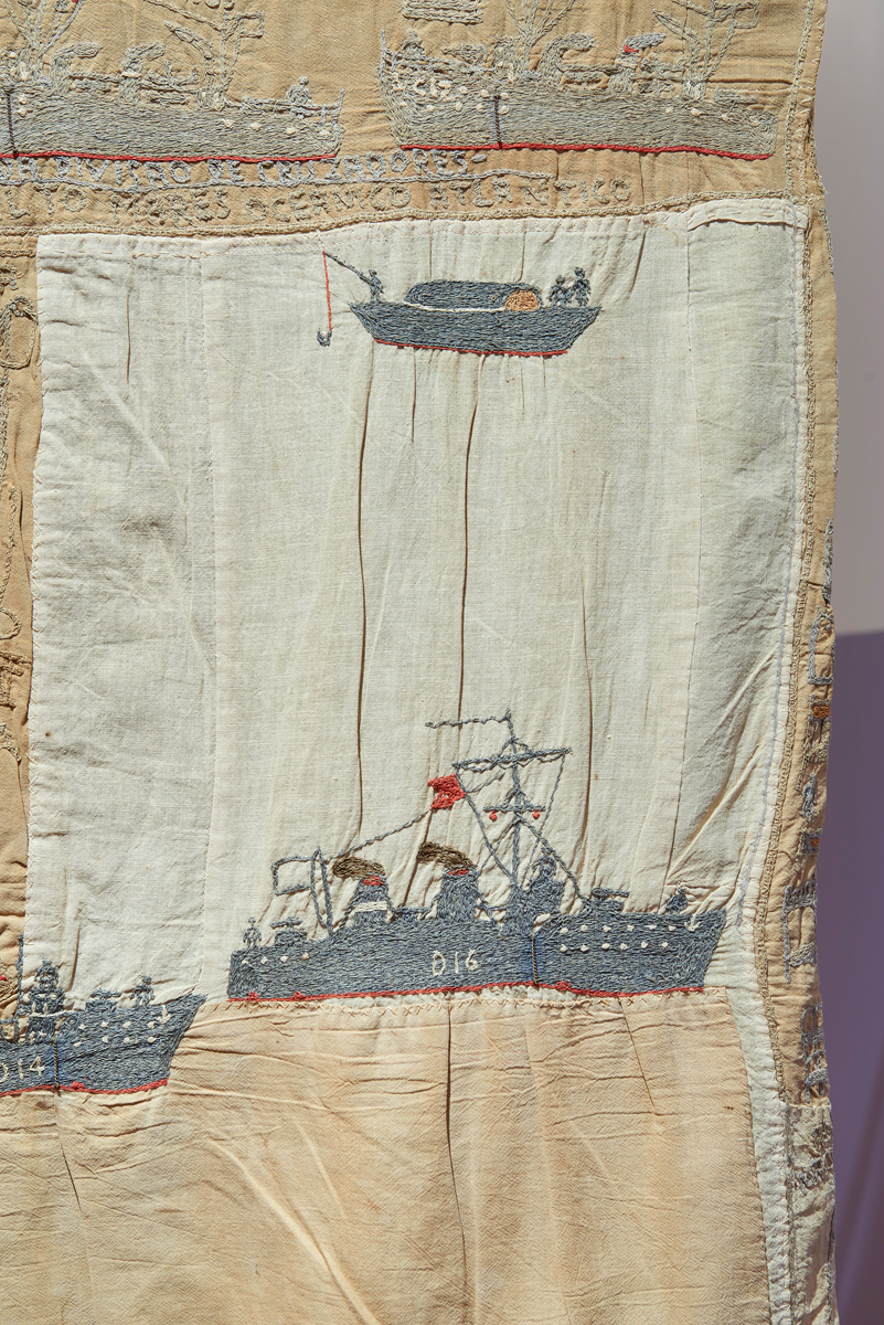 Indeed, since it first began circulating in the contemporary art world, Bispo’s work has raised questions about what it means to “clean up” his history, to extract his creations from the state apparatus in which they were made and redefine them as art. Are we imposing a decontextualized aesthetic framework onto these pieces or are we elevating them to their rightful place? Brazilian art institutions have long engaged in a complicated conversation about “arte popular” and makers who forged ahead on the periphery, or in the complete absence, of art markets; and scholars of Brazilian art, such as Kaira M. Cabañas, have nuanced overly simplistic terms, like self-taught, outsider, or folk, that are still prevalent in the US. Seeing Bispo’s work within this carefully framed exhibition sheds light on these unresolved issues of categorization. Grappling with Bispo’s oeuvre also gives texture to another stale formulation, that of embroidering and sewing as naturalized “women’s work” rather than as intentionally degraded gendered labor. The patriarchal devaluing, and hence feminizing, of needle-based textiles helps account for why so many men who are queer or otherwise marginalized have turned to fabric and thread as a creative outlet (José Leonilson and Feliciano Centurión both come to mind).