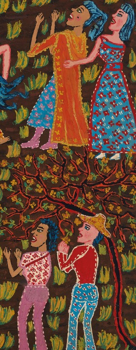 Auxiliadora was known for her depictions of Brazilian Black life, including tender scenes of intimacy between female friends. Though in the 1970s, and even today, she has been characterized as a “naive” artist, her works are technically skilled and conceptually complex. While she did not have formal academic training, she learned embroidery from her mother (who was also a sculptor), and her family was part of a larger artistic community steeped in cultural production of all kinds—music, wood carving, sculpture, painting, poetry, storytelling. She left school at the age of twelve to become a domestic housecleaner and later worked as a seamstress for factories in São Paulo. The detailed stitches on the garments worn by the figures in Capoeira and the composition’s embroidery-like embellishments demonstrate her deep knowledge of methods of textile construction. In many of her works, Auxiliadora built up surfaces, sculpting elements of relief from everyday materials that included her own black hair. And the hair of the capoeiristas in this piece is granted special attention—unruly blue and blond strands, splaying out like the winding branches of the trees, are so animated that they act as co-participants in the scene.