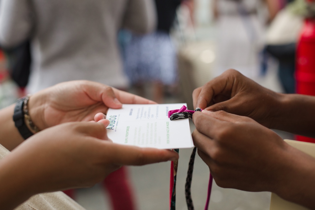Though brief, the phrases span the tender and the traumatic; taking the form of an open-ended inquiry, the postcards serve as a complement to the questions printed on the staircase. “That I am crossing a city that completes me,” reads one, departing radically in tone from the hectoring words on the steps. Each postcard comes with two lengths of string, and respondents are asked to knot the strings together, as if binding the two countries; every quipu is an accumulation of knots from one day that have been tied into a massive, dangling entity. Aguiñiga hangs these conglomerations of knotted strings from the ceiling; they stream down and pool on the floor, each a testament to hours of handiwork, as well as centuries of mutually intertwining histories.