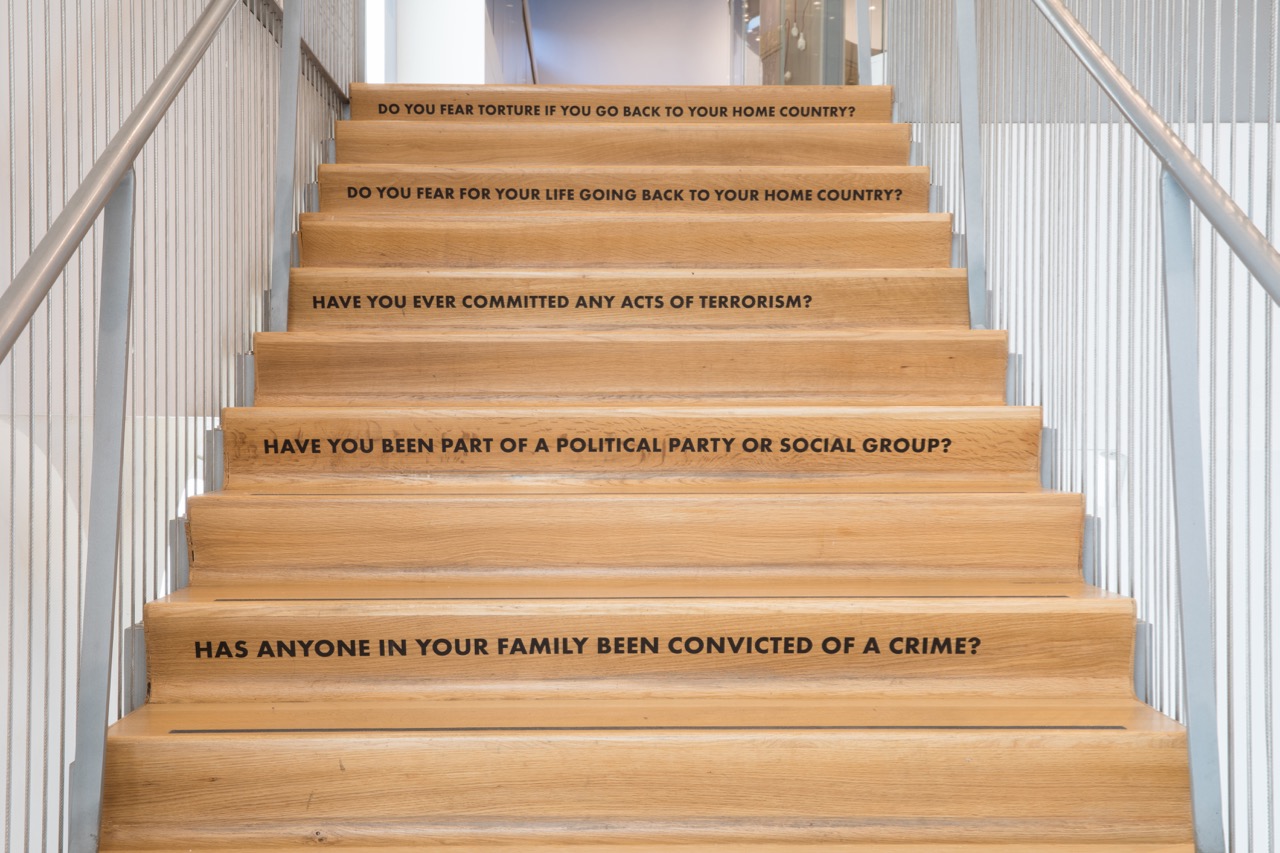 As you climb the steps to Tanya Aguiñiga’s powerful and timely exhibition at the Museum of Arts and Design (MAD), you are confronted with a series of questions inscribed on the staircase risers. They begin banally enough—“What is your name?” “Where are you going?” “What is the purpose of your trip?”—but escalate in intrusiveness as you continue to ascend. “Has anyone in your family been convicted of a crime?” “Have you ever committed any acts of terrorism?” “Do you fear for your life going back to your home country?” These queries, drawn from the scripts of border control and migrant detention center agents, set the tone for the Los Angeles–based artist’s intensely interrogative and tactile exploration of economic, political, and emotional exchanges that transpire along the seam between the US and Mexico. Taken as a whole, Aguiñiga’s practice argues that while dividing populations and landscapes, this seam also irrevocably sutures the two countries together.