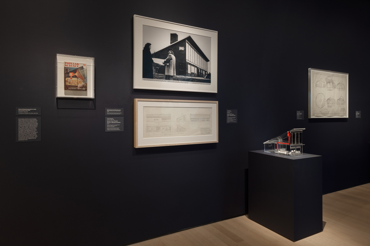 Emerging Ecologies: Architecture and the Rise of Environmentalism, installation view. Courtesy Museum of Modern Art. Photo: Jonathan Dorado. Pictured, center top: Eleanor Raymond and Mária Telkes at the Dover Sun House, Dover, Massachusetts, 1948. Lower right, on plinth: Model reproduction of Dover Sun House, Dover, Massachusetts, commissioned 2023.