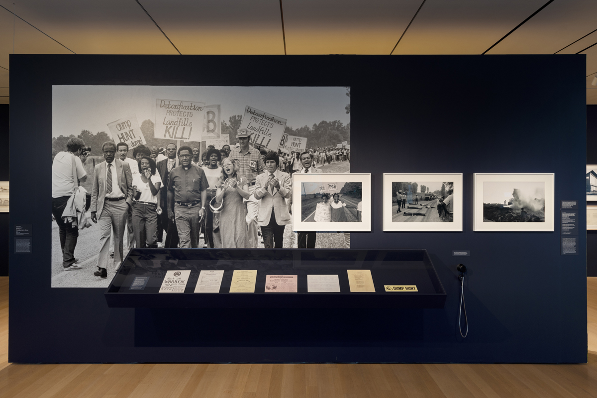 Emerging Ecologies: Architecture and the Rise of Environmentalism, installation view. Courtesy Museum of Modern Art. Photo: Jonathan Dorado. Pictured, center left: Protesters marching against a PCB landfill in Afton, Warren County, North Carolina, led by Reverend Leon White (second from left), Reverend Joseph Lowery (center), and Ken Ferruccio (second from right), 1982. Courtesy Getty Images, Bettmann Archive. Photo: Otto Ludwig Bettmann.